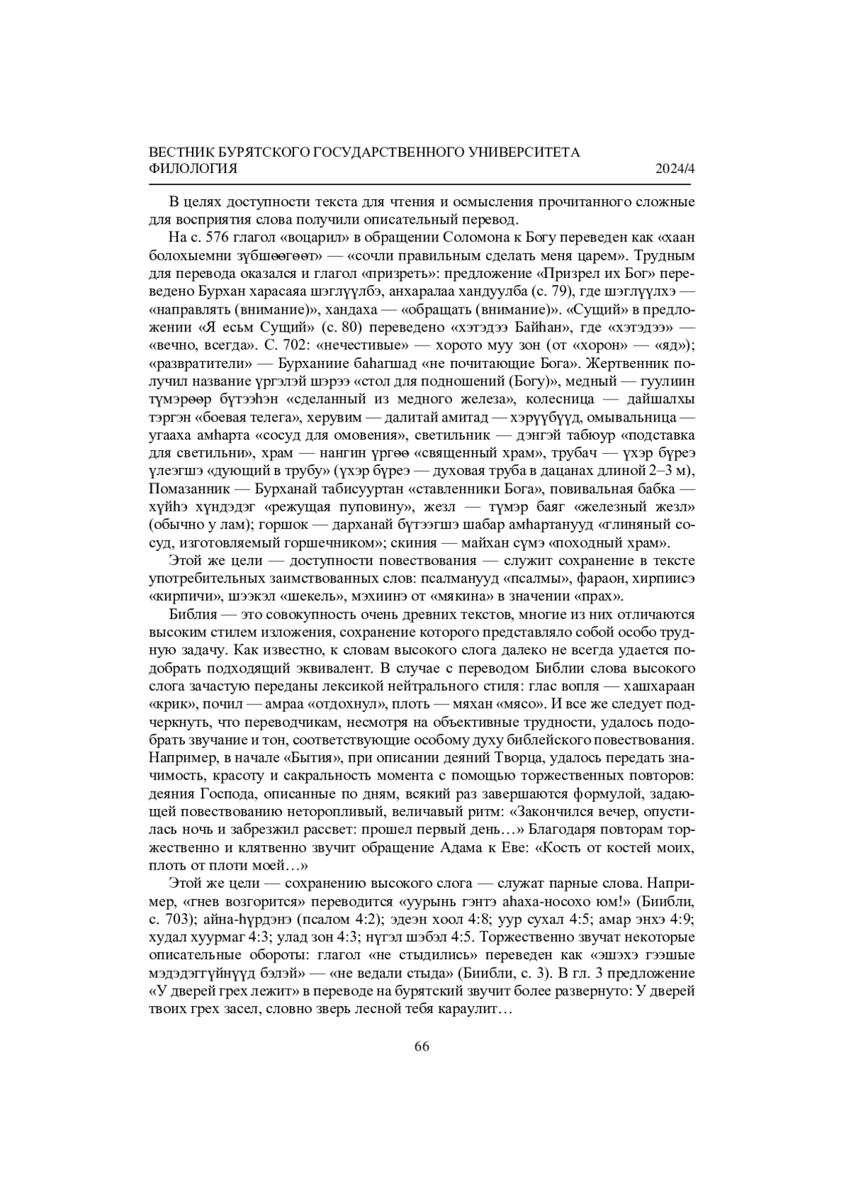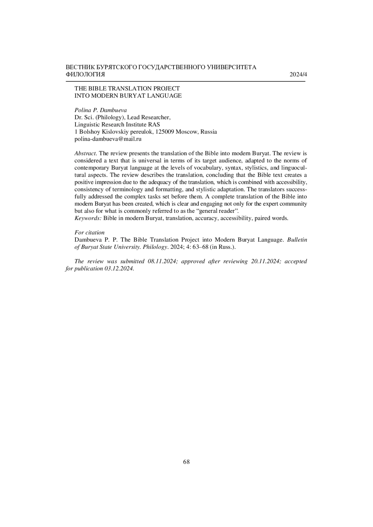 Рецензия посвящена переводу Библии на современный бурятский язык. Работа рассматривается как текст, универсальный в плане целевой аудитории, адаптированный к нормам современного бурятского языка на уровне лексики, синтаксиса, стилистики, лингвокультурологии. В рецензии дается описание перевода, на основании которого делается вывод о том, что текст Библии производит хорошее впечатление адекватностью перевода, сочетающейся с доступностью, последовательностью терминологии и оформления, стилистической адаптированностью. Переводчикам удалось решить поставленные перед ними сложные задачи. Создан полный перевод Библии на современном бурятском языке, понятный и интересный не только экспертному сообществу, но и тем, кого принято называть «рядовым читателем».