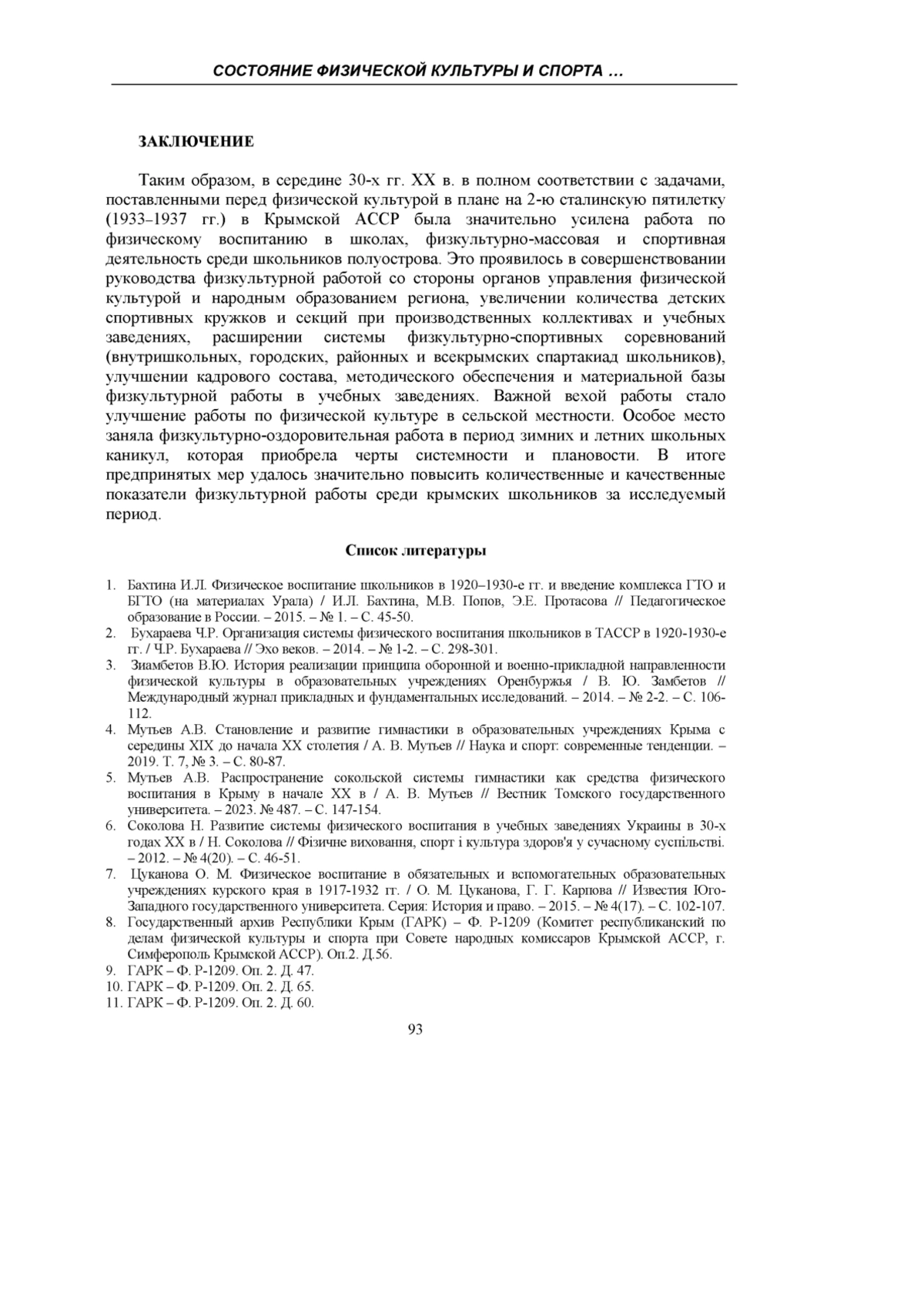 На основе анализа архивных документов, рассматривается состояние физического воспитания, физкультурно-массовой и спортивной работы среди школьников Крыма в середине 1930-х гг. Установлено, что в исследуемый период была значительно усилена работа по физическому воспитанию в школах, физкультурно-массовая и спортивная деятельность среди школьников полуострова. Совершенствовалось руководство физкультурной работой, увеличивалось количество детских спортивных кружков и секций, расширялась система физкультурно-спортивных соревнований, улучшалось кадровое и методическое обеспечение, а также материальная база физкультурной работы в учебных заведениях. Физкультурно-оздоровительная работа в период зимних и летних школьных каникул приобрела черты системности и плановости. В итоге предпринятых мер удалось значительно повысить количественные и качественные показатели физкультурной работы среди крымских школьников.