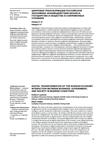Статья: ЦИФРОВАЯ ТРАНСФОРМАЦИЯ РОССИЙСКОЙ ЭКОНОМИКИ: ВЗАИМОДЕЙСТВИЕ БИЗНЕСА, ГОСУДАРСТВА И ОБЩЕСТВА В СОВРЕМЕННЫХ УСЛОВИЯХ (2025)