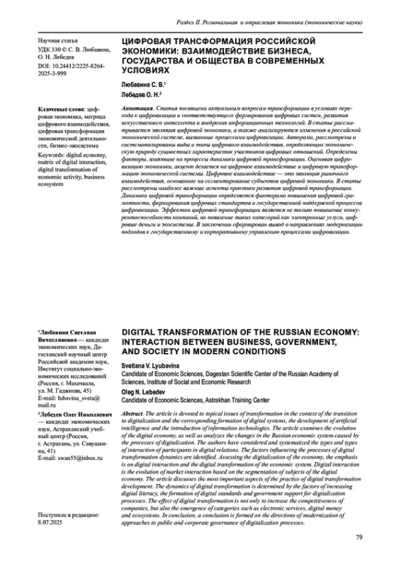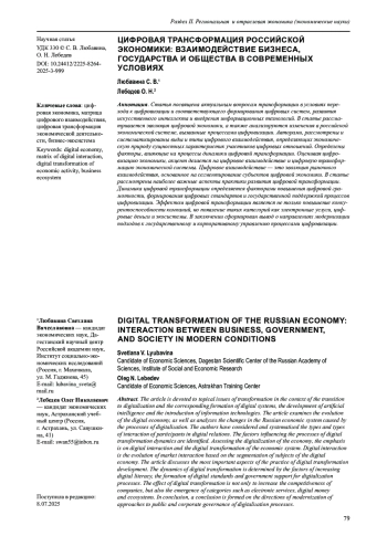 ЛЮБАВИНА С. В., ЛЕБЕДЕВ О. Н. ЦИФРОВАЯ ТРАНСФОРМАЦИЯ РОССИЙСКОЙ ЭКОНОМИКИ: ВЗАИМОДЕЙСТВИЕ БИЗНЕСА, ГОСУДАРСТВА И ОБЩЕСТВА В СОВРЕМЕННЫХ УСЛОВИЯХ // ВЕСТНИК СИБИРСКОГО ИНСТИТУТА БИЗНЕСА И ИНФОРМАЦИОННЫХ ТЕХНОЛОГИЙ. 2025. ТОМ 14, № 3