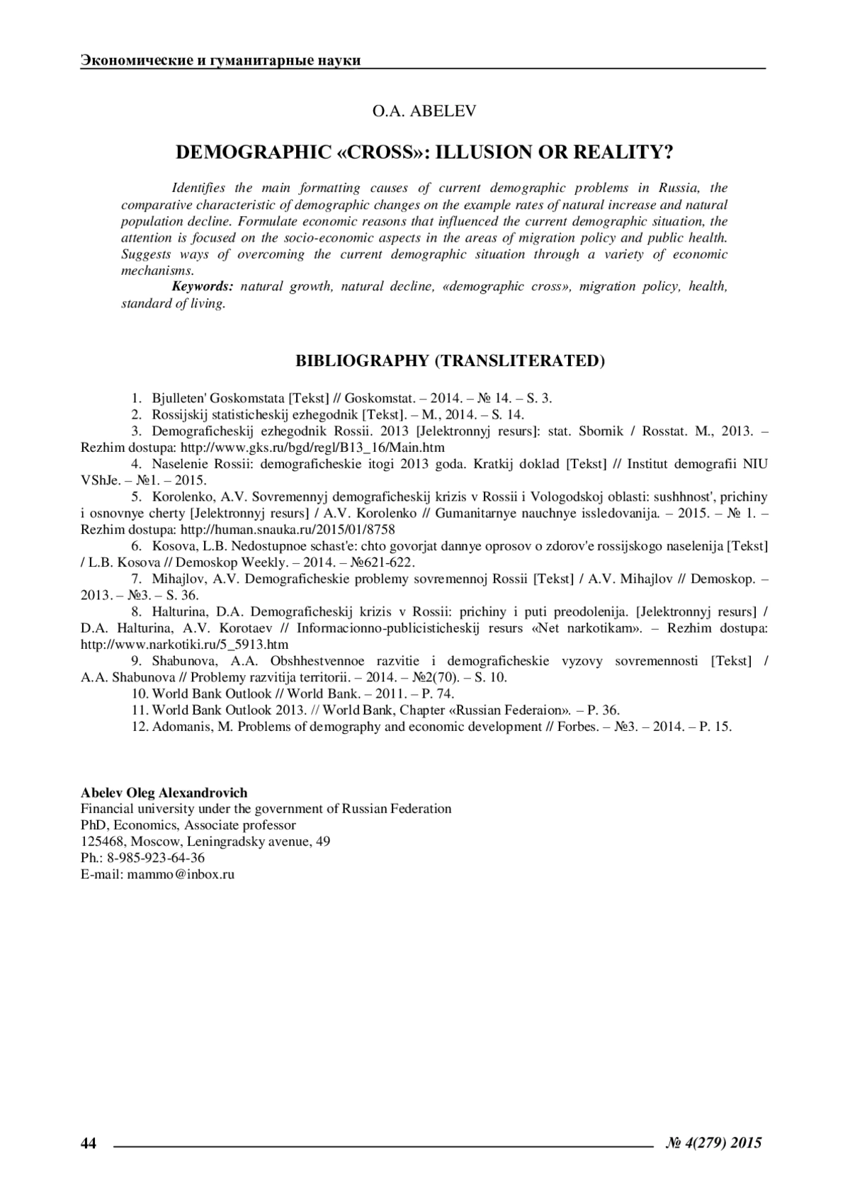 АБЕЛЕВ О. А. ДЕМОГРАФИЧЕСКИЙ "КРЕСТ": ИЛЛЮЗИЯ ИЛИ РЕАЛЬНОСТЬ? // ЭКОНОМИЧЕСКИЕ И ГУМАНИТАРНЫЕ НАУКИ. 2015. № 4 (279)