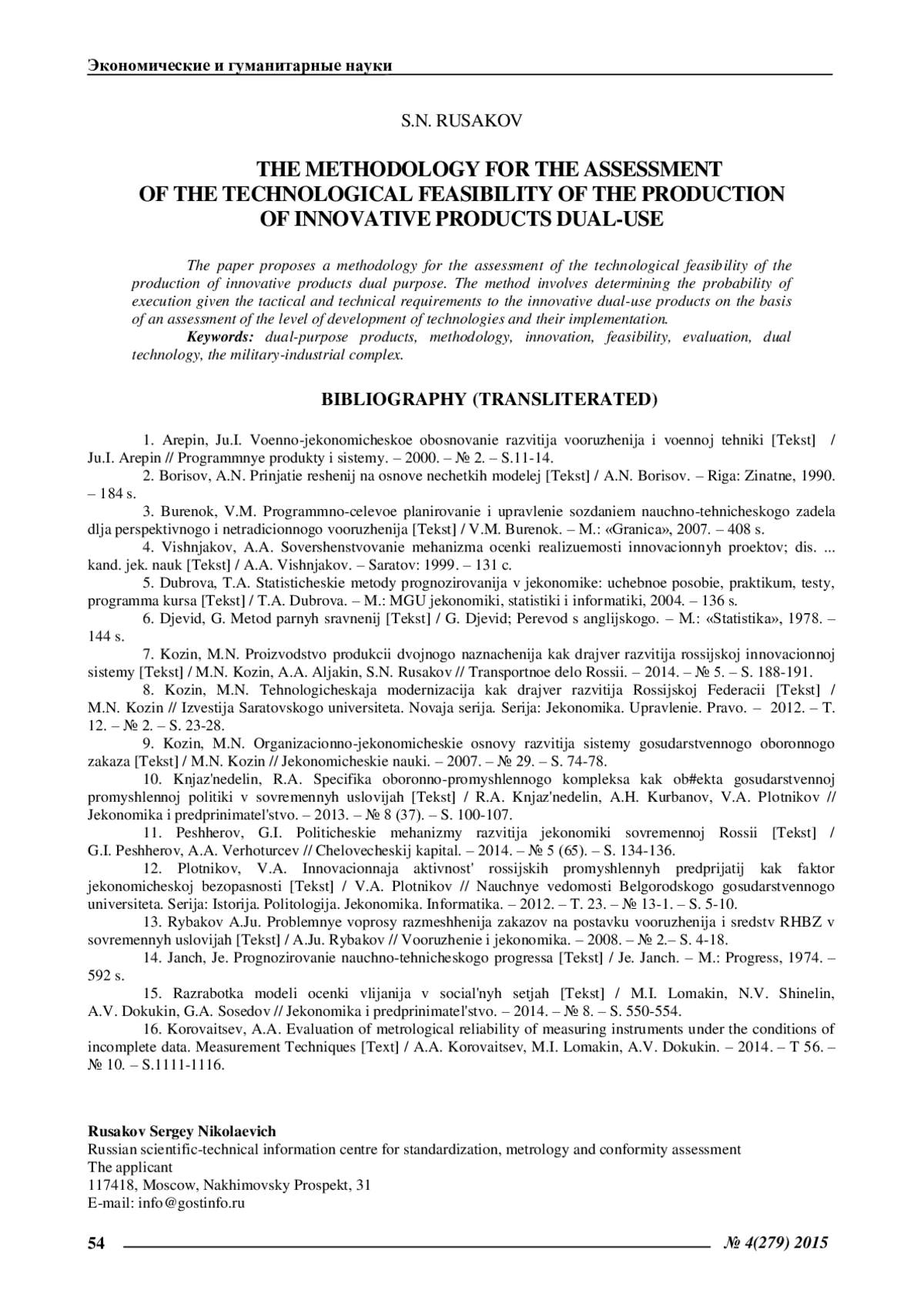 РУСАКОВ С. Н. МЕТОДИКА ОЦЕНКИ ТЕХНОЛОГИЧЕСКОЙ РЕАЛИЗУЕМОСТИ ПРОИЗВОДСТВА ИННОВАЦИОННОЙ ПРОДУКЦИИ ДВОЙНОГОНАЗНАЧЕНИЯ // ЭКОНОМИЧЕСКИЕ И ГУМАНИТАРНЫЕ НАУКИ. 2015. № 4 (279)