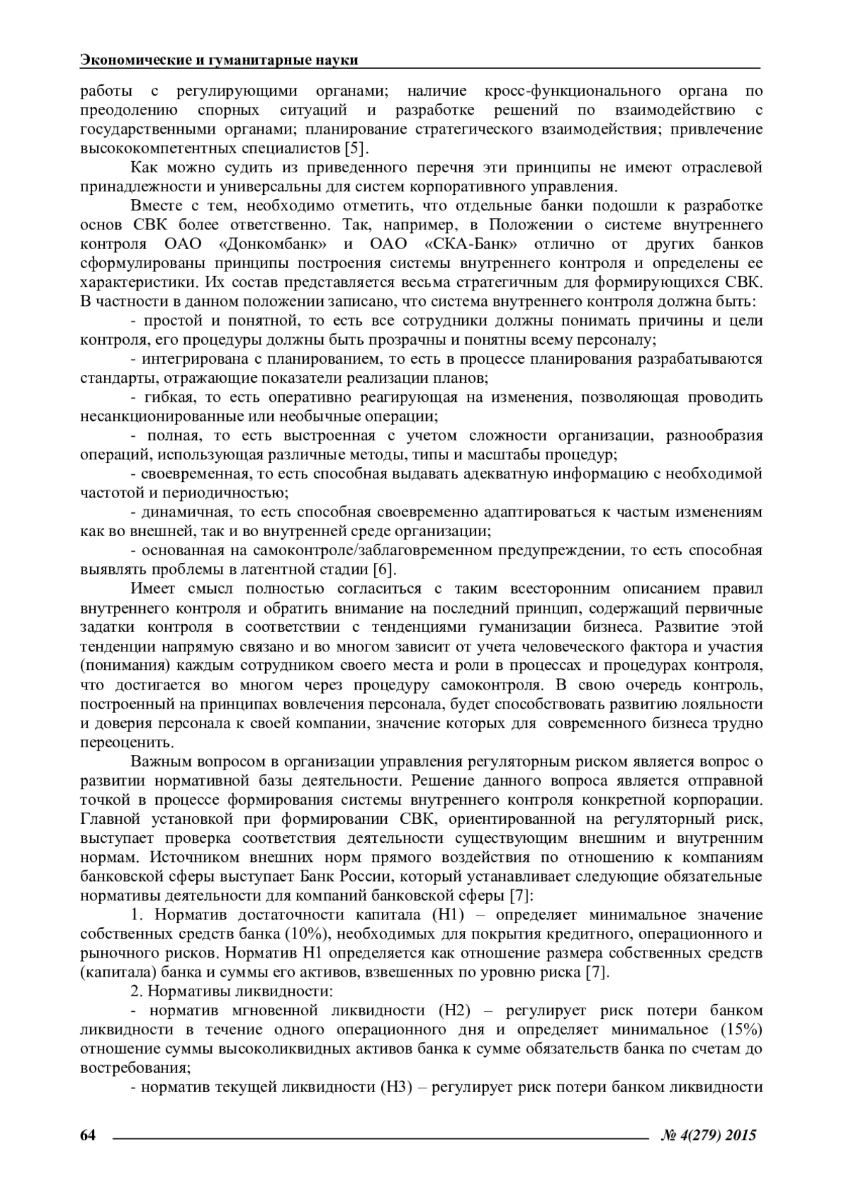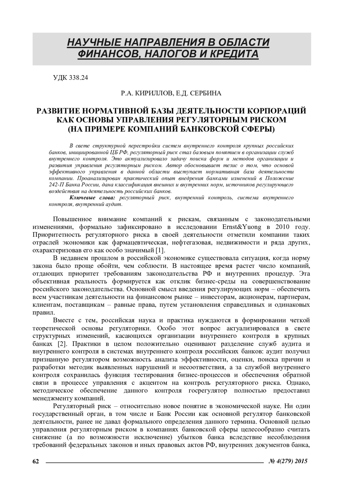 КИРИЛЛОВ Р. А., СЕРБИНА Е. Д. РАЗВИТИЕ НОРМАТИВНОЙ БАЗЫ ДЕЯТЕЛЬНОСТИ КОРПОРАЦИЙ КАК ОСНОВЫ УПРАВЛЕНИЯ РЕГУЛЯТОРНЫМ РИСКОМ(НА ПРИМЕРЕ КОМПАНИЙ БАНКОВСКОЙ СФЕРЫ) // ЭКОНОМИЧЕСКИЕ И ГУМАНИТАРНЫЕ НАУКИ. 2015. № 4 (279)