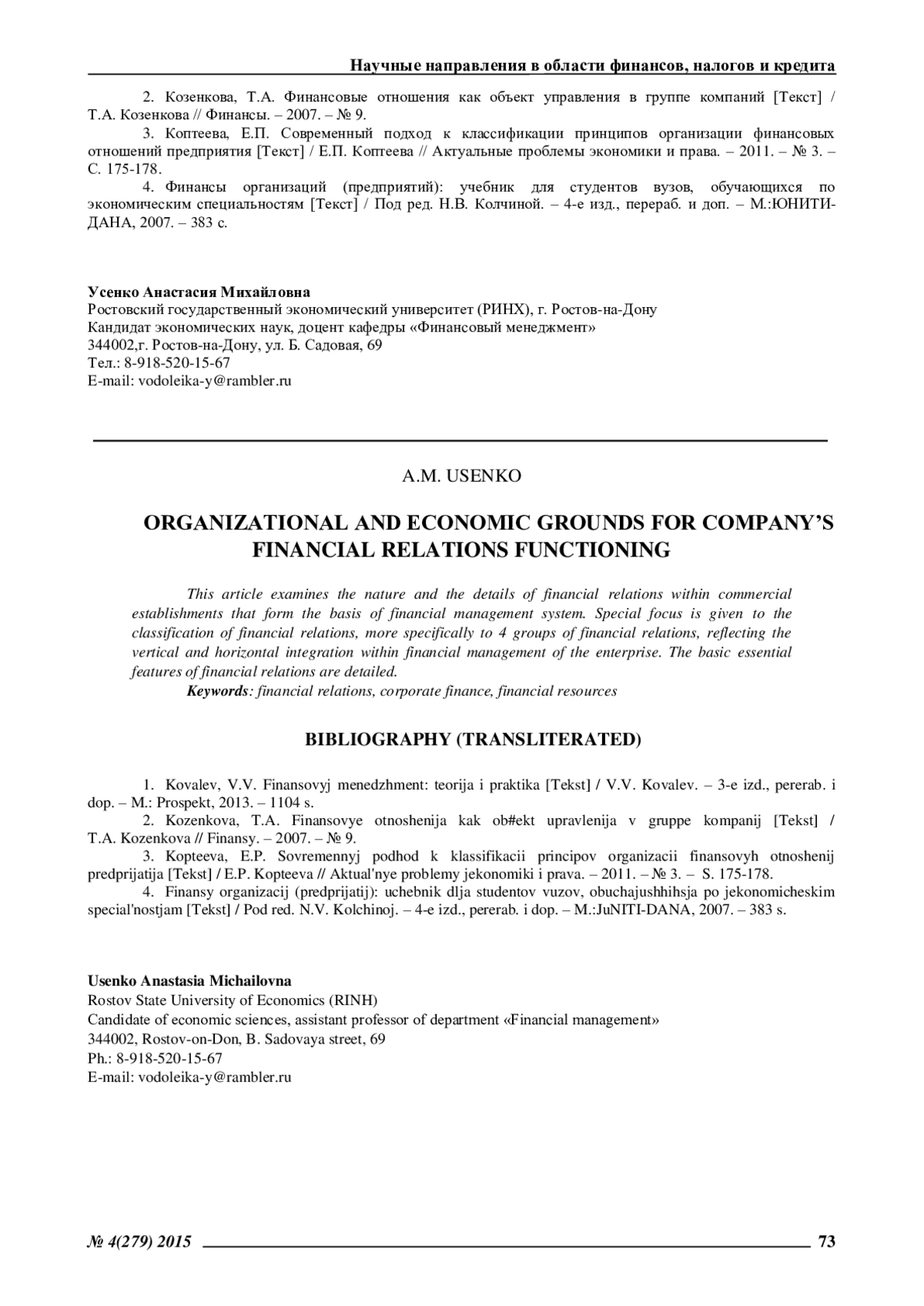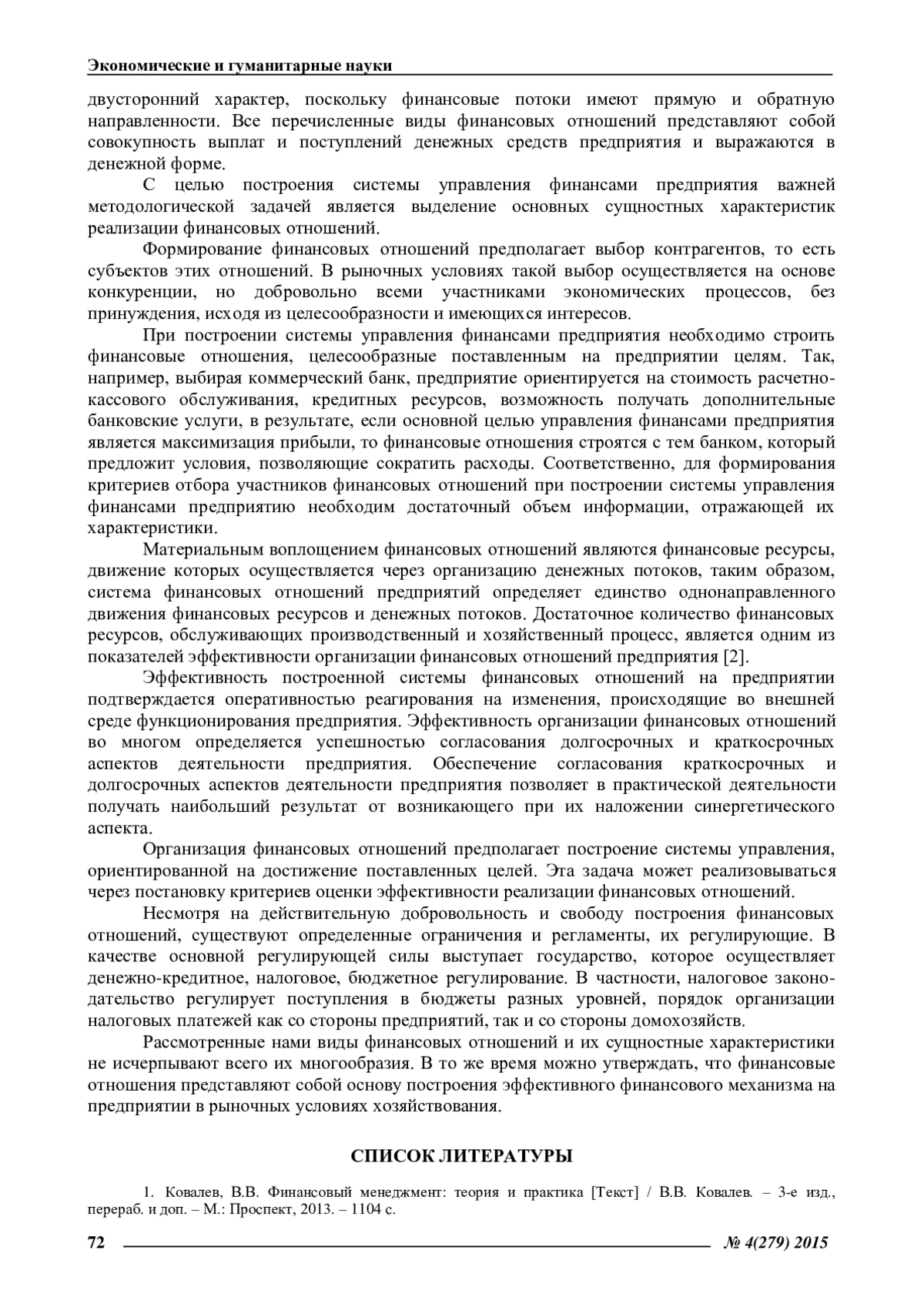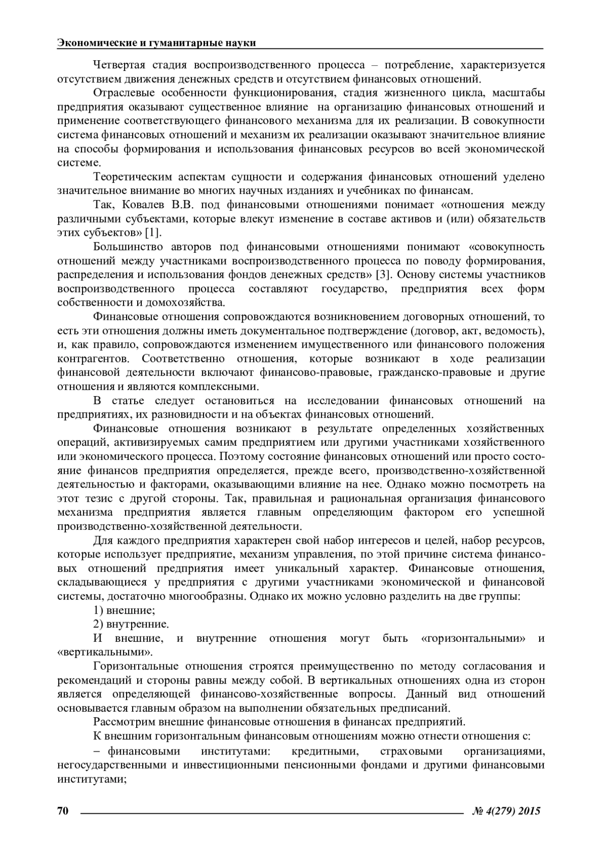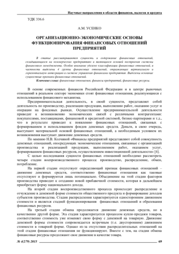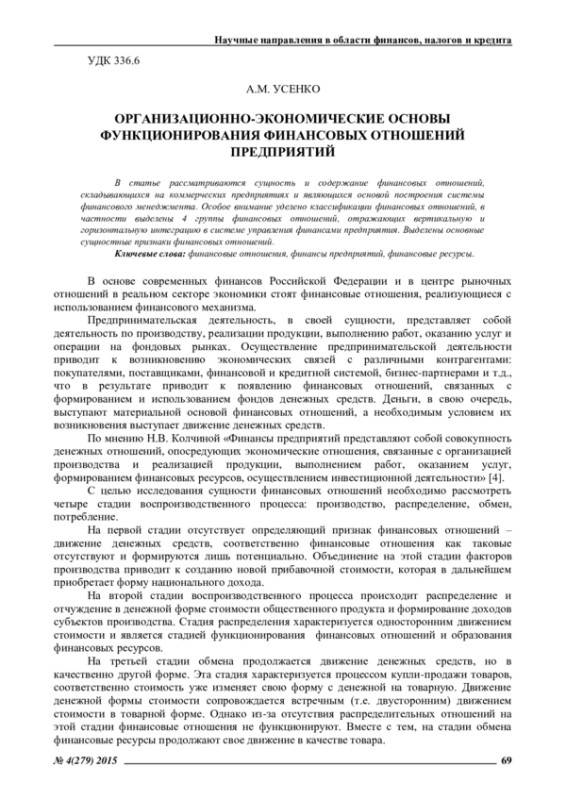 УСЕНКО А. М. ОРГАНИЗАЦИОННО-ЭКОНОМИЧЕСКИЕ ОСНОВЫ ФУНКЦИОНИРОВАНИЯ ФИНАНСОВЫХ ОТНОШЕНИЙ ПРЕДПРИЯТИЙ // ЭКОНОМИЧЕСКИЕ И ГУМАНИТАРНЫЕ НАУКИ. 2015. № 4 (279)