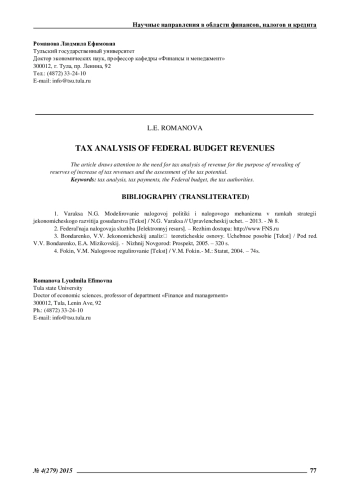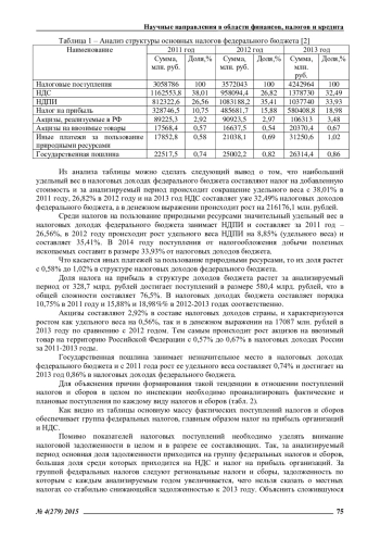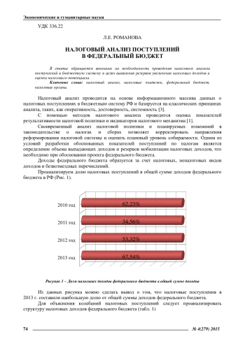 РОМАНОВА Л. Е. НАЛОГОВЫЙ АНАЛИЗ ПОСТУПЛЕНИЙ В ФЕДЕРАЛЬНЫЙ БЮДЖЕТ // ЭКОНОМИЧЕСКИЕ И ГУМАНИТАРНЫЕ НАУКИ. 2015. № 4 (279)