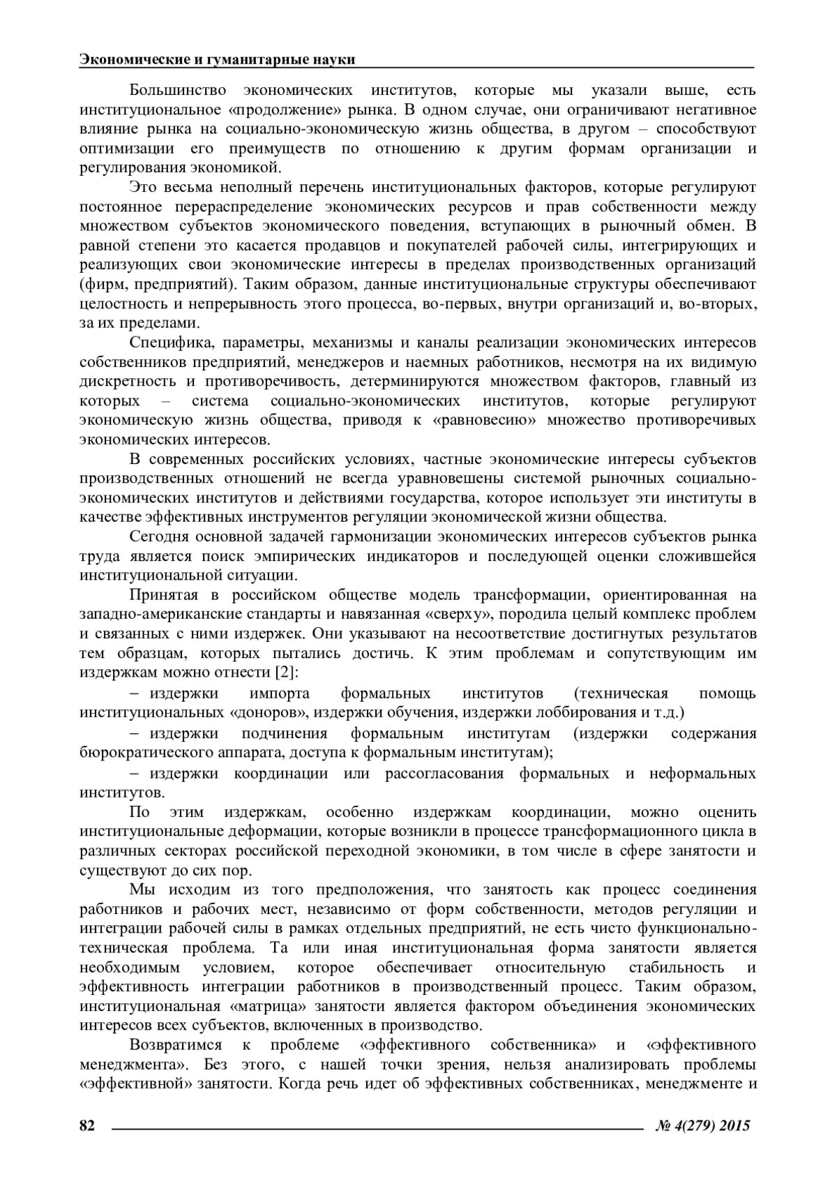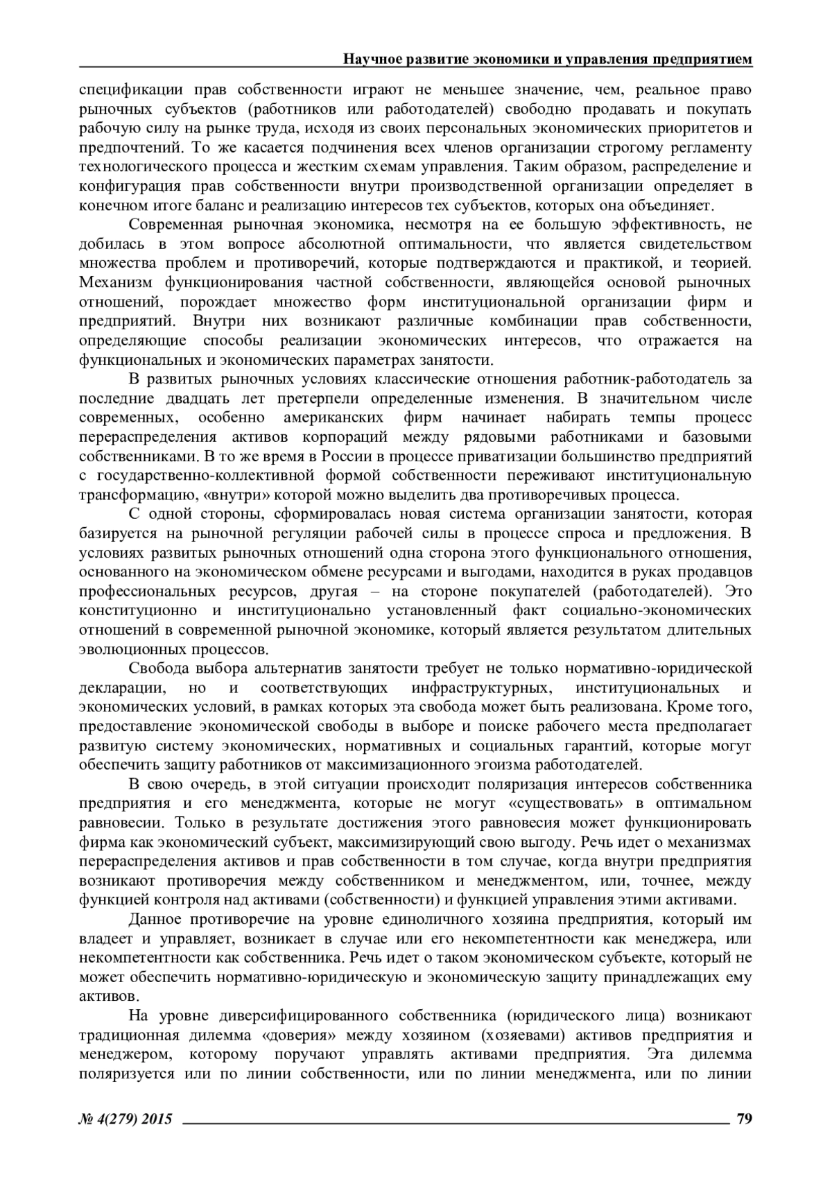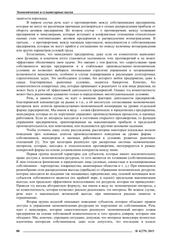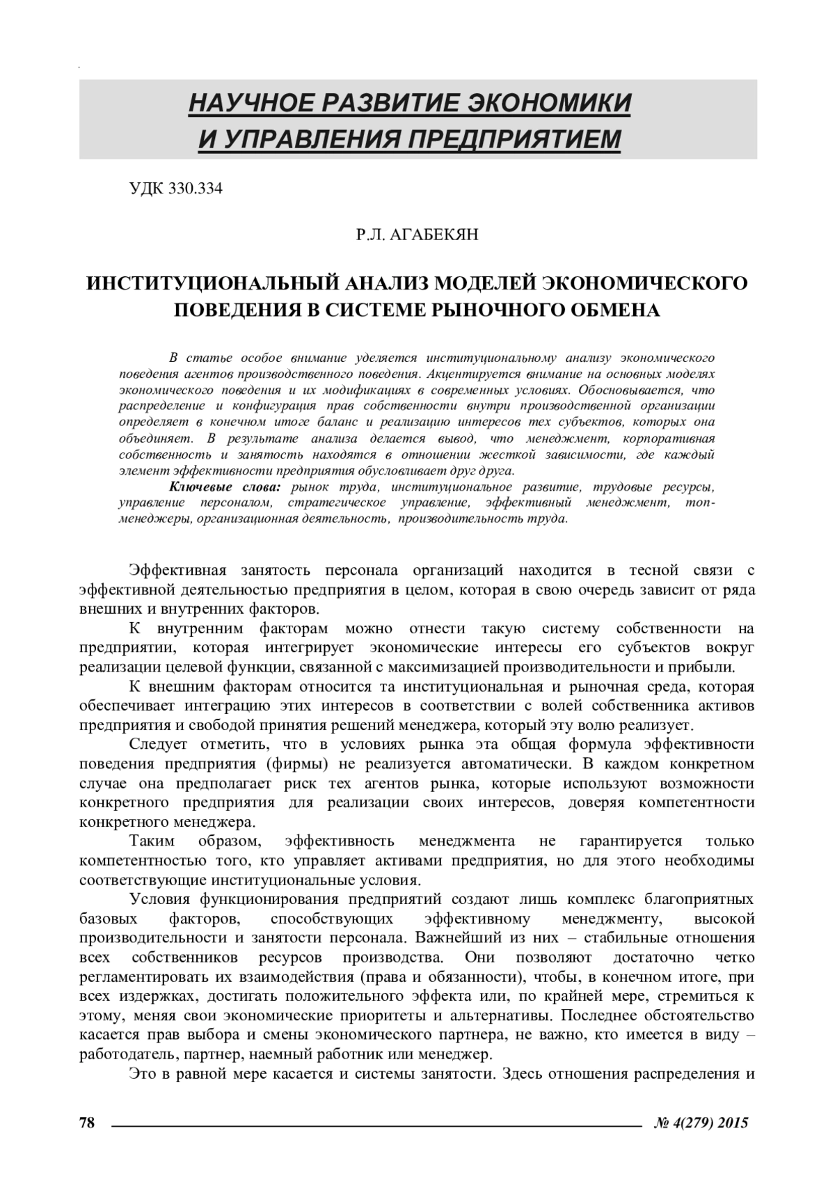 В статье особое внимание уделяется институциональному анализу экономического поведения агентов производственного поведения. Акцентируется внимание на основных моделях экономического поведения и их модификациях в современных условиях. Обосновывается, что распределение и конфигурация прав собственности внутри производственной организации определяет в конечном итоге баланс и реализацию интересов тех субъектов, которых она объединяет. В результате анализа делается вывод, что менеджмент, корпоративная собственность и занятость находятся в отношении жесткой зависимости, где каждый элемент эффективности предприятия обусловливает друг друга