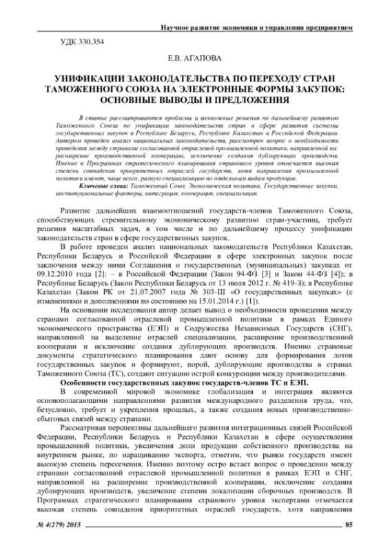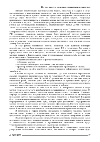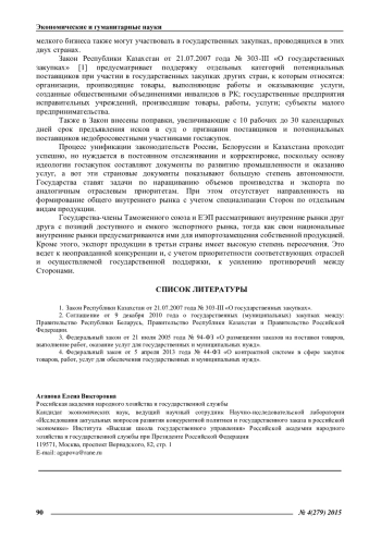 В работе проведен анализ национальных законодательств Республики Казахстан, Республики Беларусь и Российской Федерации в сфере электронных закупок после заключения между ними Соглашения о государственных (муниципальных) закупках от 09.12.2010 года [2]: – в Российской Федерации (Закон 94-ФЗ [3] и Закон 44-ФЗ [4]); в Республике Беларусь (Закон Республики Беларусь от 13 июля 2012 г. No 419-З); в Республике Казахстан (Закон РК от 21.07.2007 года No 303-III «О государственных закупках» (с изменениями и дополнениями по состоянию на 15.01.2014 г.)