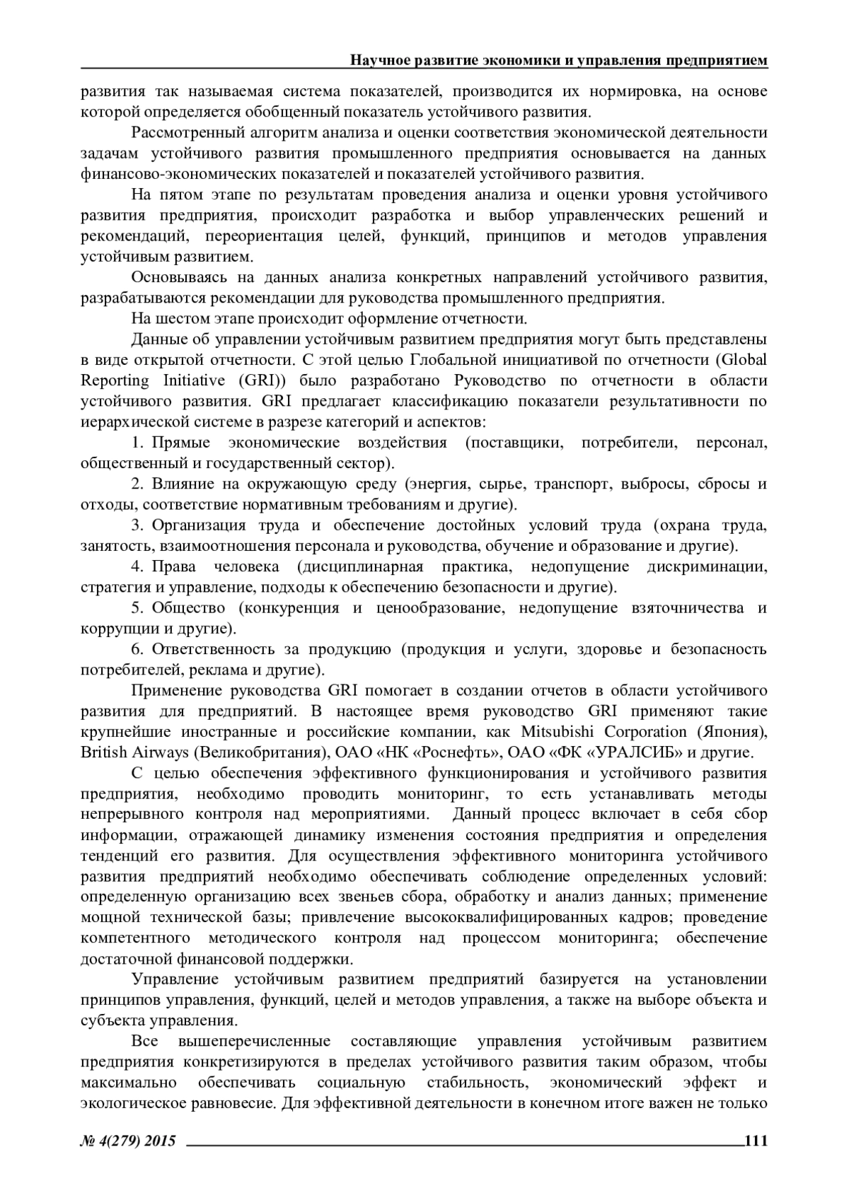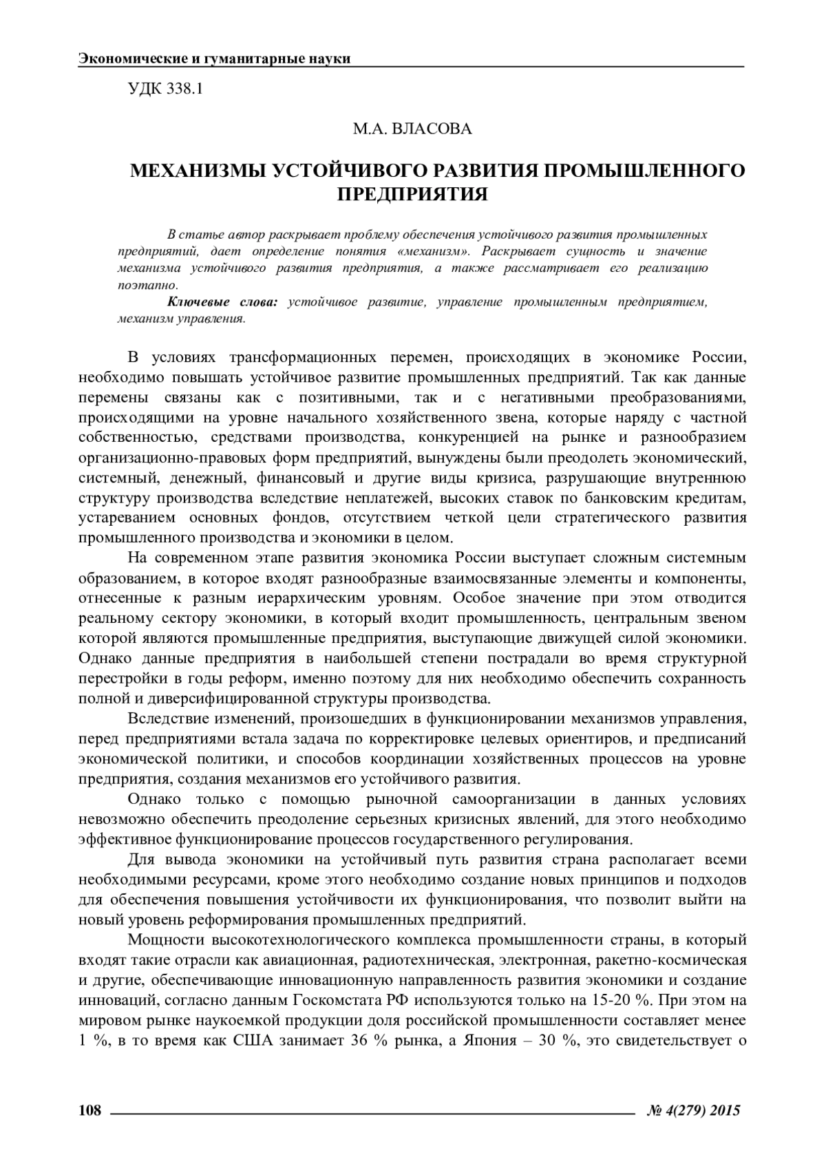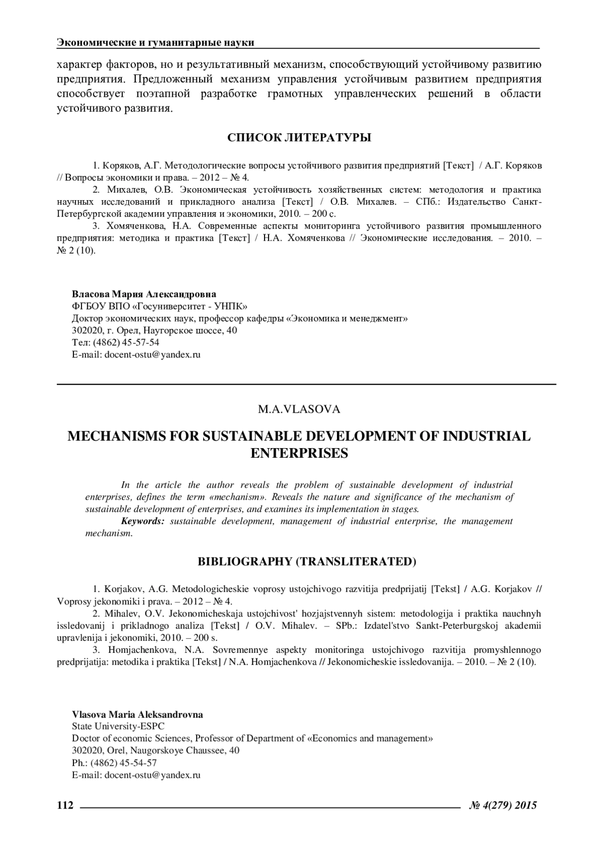 ВЛАСОВА М. А. МЕХАНИЗМЫ УСТОЙЧИВОГО РАЗВИТИЯ ПРОМЫШЛЕННОГО ПРЕДПРИЯТИЯ // ЭКОНОМИЧЕСКИЕ И ГУМАНИТАРНЫЕ НАУКИ. 2015. № 4 (279)