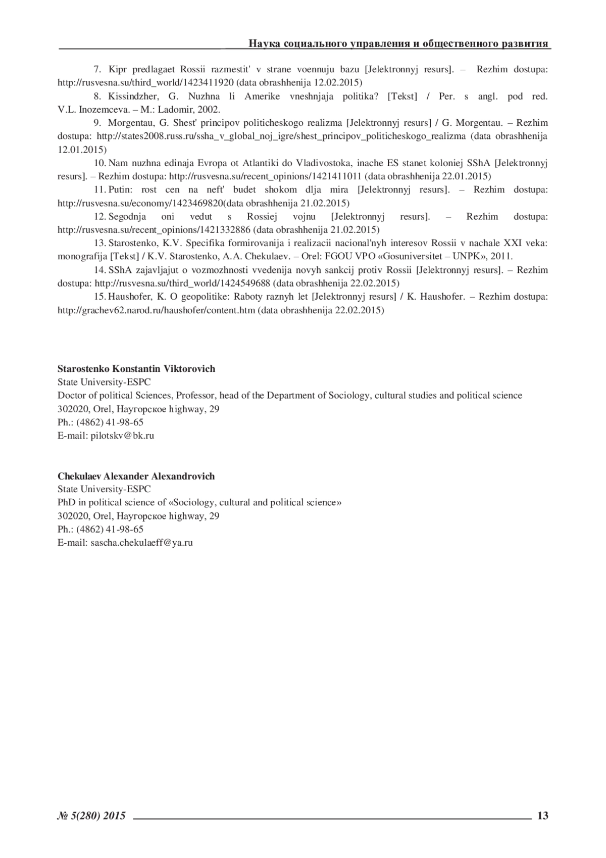 СТАРОСТЕНКО К. В., ЧЕКУЛАЕВ А. А. НАЦИОНАЛЬНЫЕ ИНТЕРЕСЫ РОССИИ В УСЛОВИЯХ СОВРЕМЕННЫХ ГЕОПОЛИТИЧЕСКИХ РИСКОВ // ЭКОНОМИЧЕСКИЕ И ГУМАНИТАРНЫЕ НАУКИ. 2015. № 5 (280)