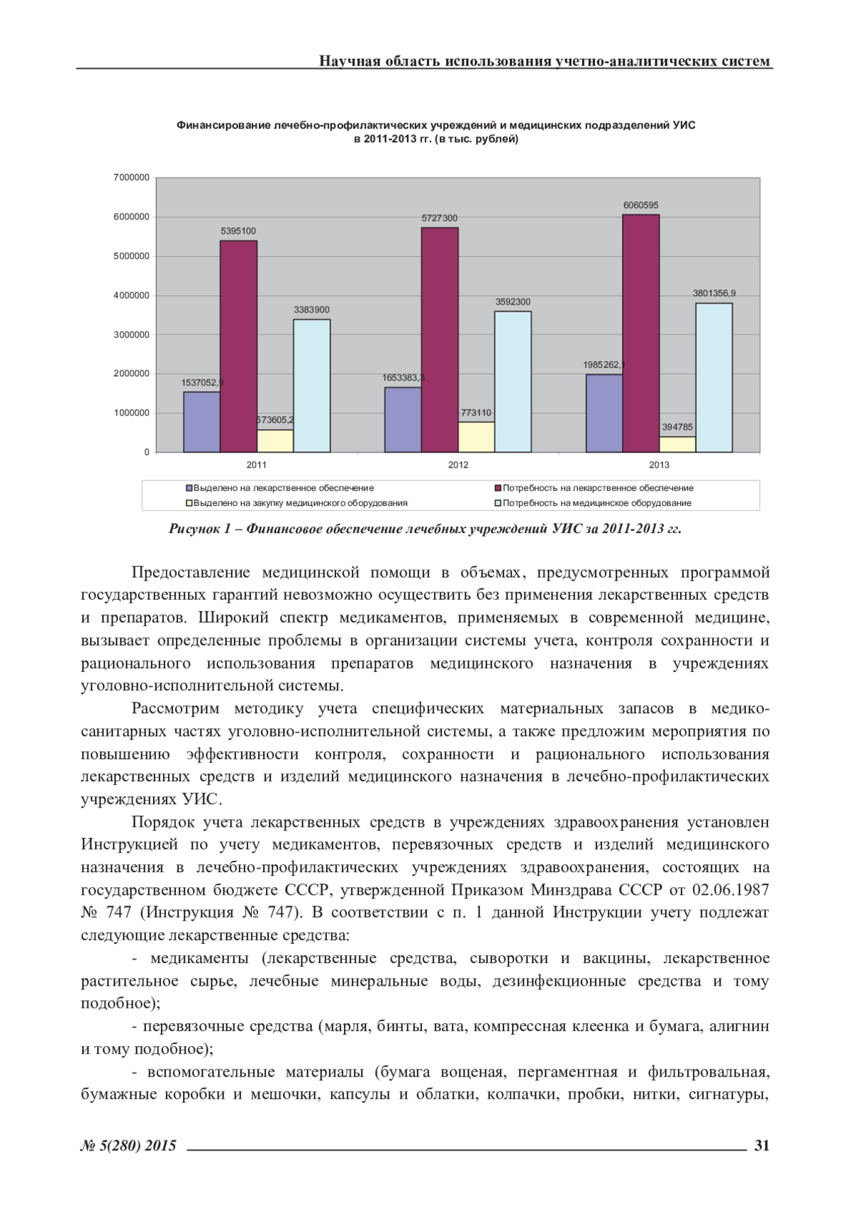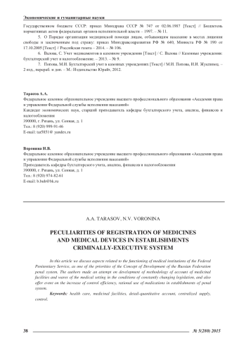 В статье рассматриваются аспекты, связанные с функционированием медицинских учреждений Федеральной службы исполнения наказаний, как одно из приоритетных направлений Концепции развития РФ уголовно-исполнительной системы. Авторами предпринята попытка по разработке методики учета лекарственных средств и изделий медицинского назначения в условиях постоянно меняющегося законодательства, а также предложены мероприятия по повышению эффективности контроля, рационального использования медикаментов в учреждениях уголовно-исполнительной системы