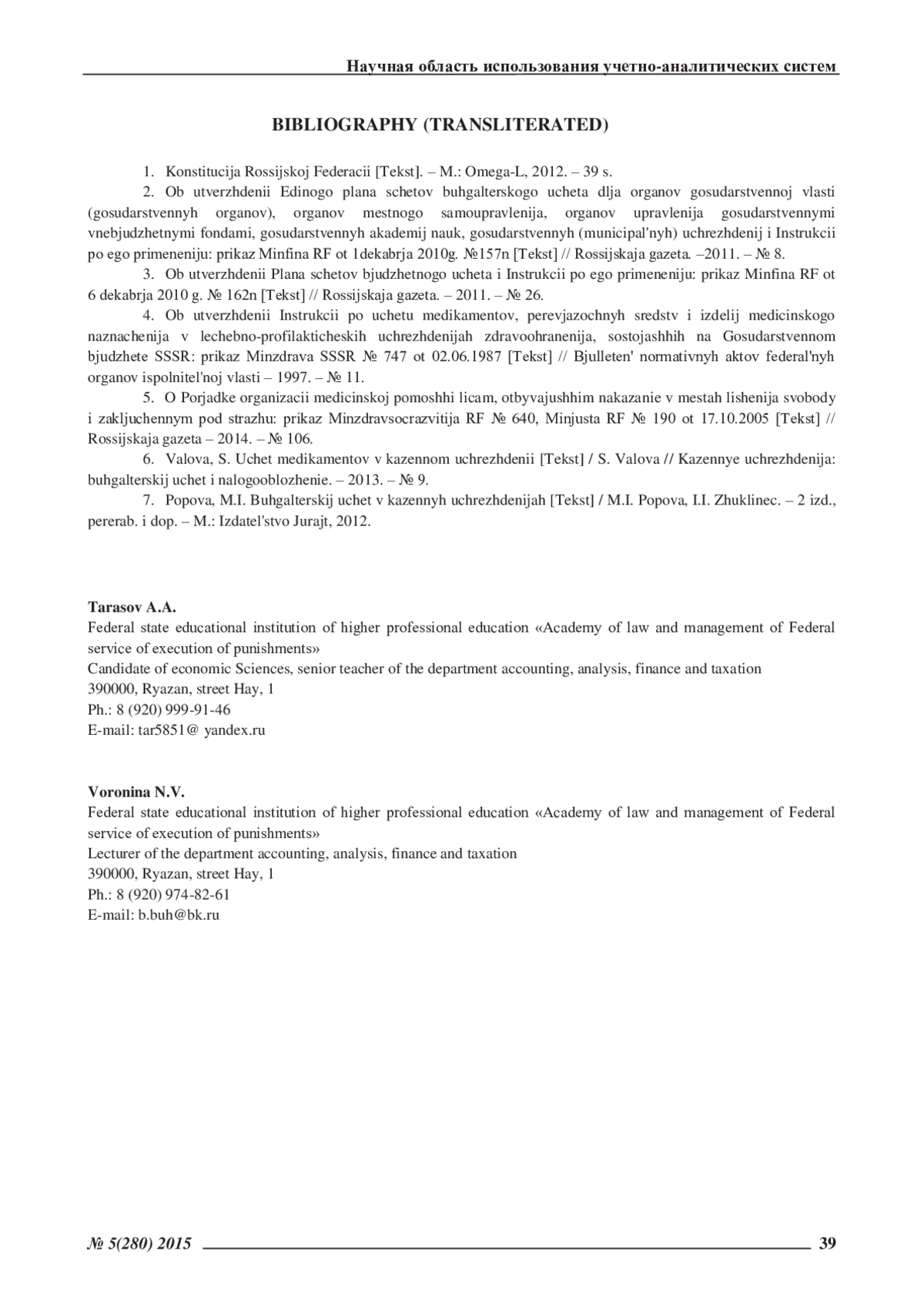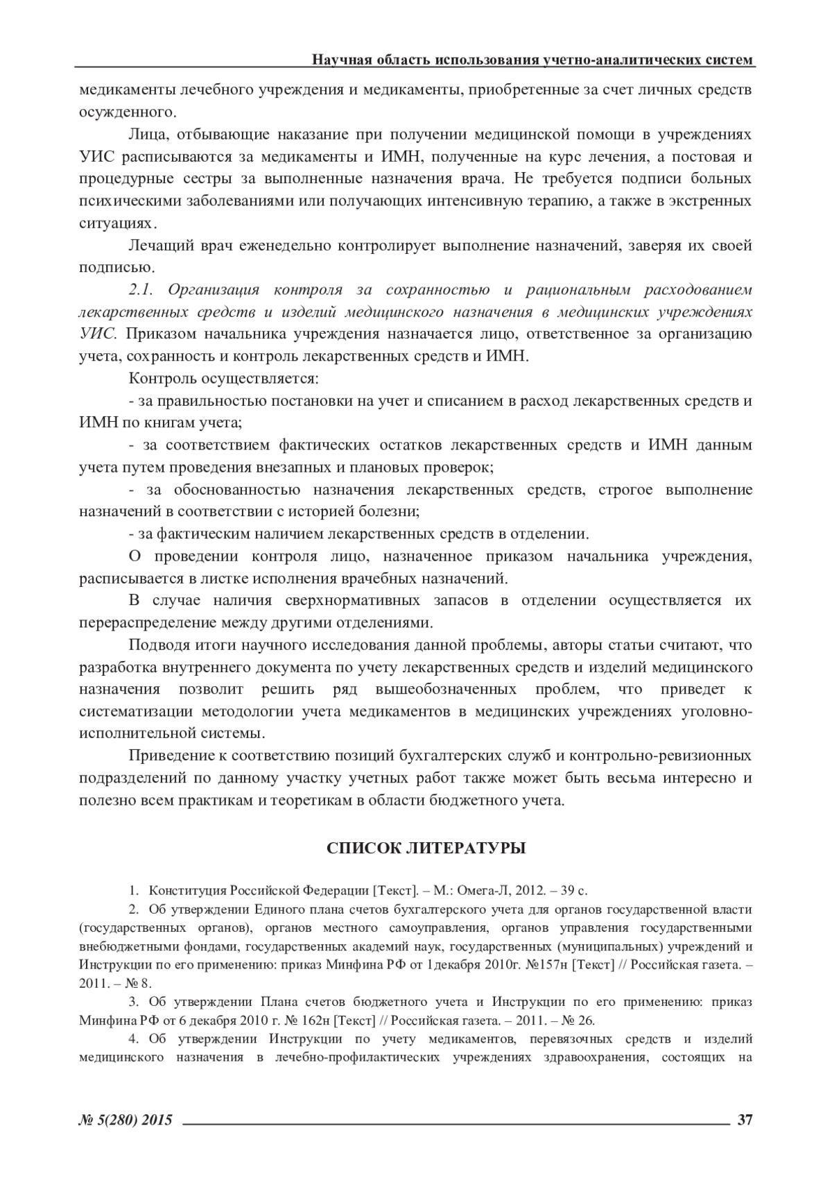 6. Валова, С. Учет медикаментов в казенном учреждении [Текст] / С. Валова // Казенные учреждения: бухгалтерский учет и налогообложение. - 2013. - № 9.