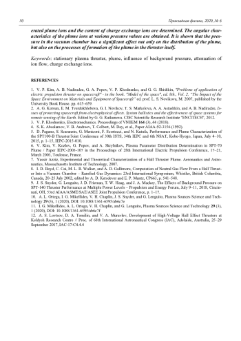 5. Pagano D., Scaranzin S., Meniconi G., Scortecci F., Kutufa N. Performance and Plume Characterization of the SPT100-B Thruster/Joint Conference of 30th ISTS, 34th IEPC and 6th NSAT, Kobe-Hyogo, Japan, July 4–10, 2015, p. 1–15, IEPC-2015-010.
