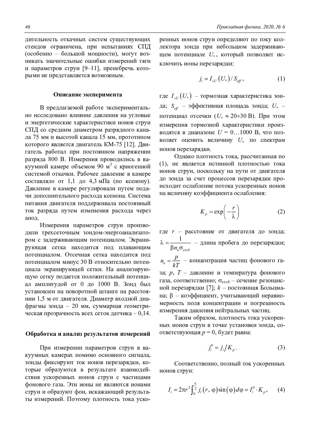 Таким образом, проведенные исследования показали, что давление фонового газа оказывает существенное влияние на параметры струи СПД, особенно в приосевой и периферийной областях течения. Причиной этих изменений является изменение конфигурации электрического поля в разрядном канале двигателя. Ток ионов перезарядки, образующихся в результате взаимодействия ионов струи с фоновым газом и фиксируемый зондамиэнергоанализаторами в периферийной зоне струи, при давлении в камере 3–4 мПа может достигать 90–99 %. В связи этим для получения достоверных данных о параметрах струи измерения рекомендуется проводить при давлении в камере не выше 1–2 мПа (по ксенону). При обработке результатов измерений ионы перезарядки следует исключать из энергетического спектра ионов струи. Вопросы влияния фонового давления на результаты измерений параметров струи особенно актуальны при испытаниях мощных СПД при ограниченной скорости откачки вакуумных систем.