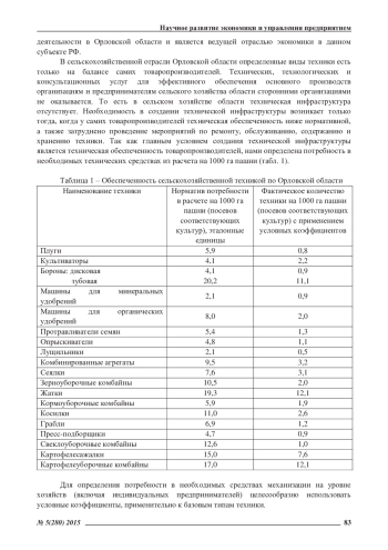 В статье на базе сопоставительного анализа существующих методик технического обеспечения производства сельскохозяйственной продукции и учитывая современные требования к видам сельскохозяйственной техники, с учетом отраслевой специфики, разработана методика расчета технической обеспеченности сельскохозяйственной отрасли, а также, исходя из критерия экономической эффективности производства, предложена авторская методика оценки влияния технической обеспеченности на эффективность зернового производства с использованием метода многомерной группировки