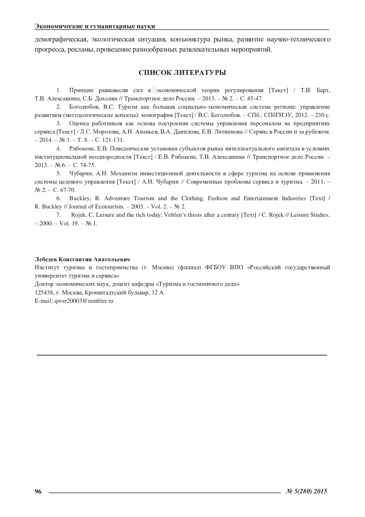ЛЕБЕДЕВ К. А. СОВЕРШЕНСТВОВАНИЕ ТЕРРИТОРИАЛЬНОЙ ОРГАНИЗАЦИИ РЕКРЕАЦИОННЫХ КОМПЛЕКСОВ // ЭКОНОМИЧЕСКИЕ И ГУМАНИТАРНЫЕ НАУКИ. 2015. № 5 (280)