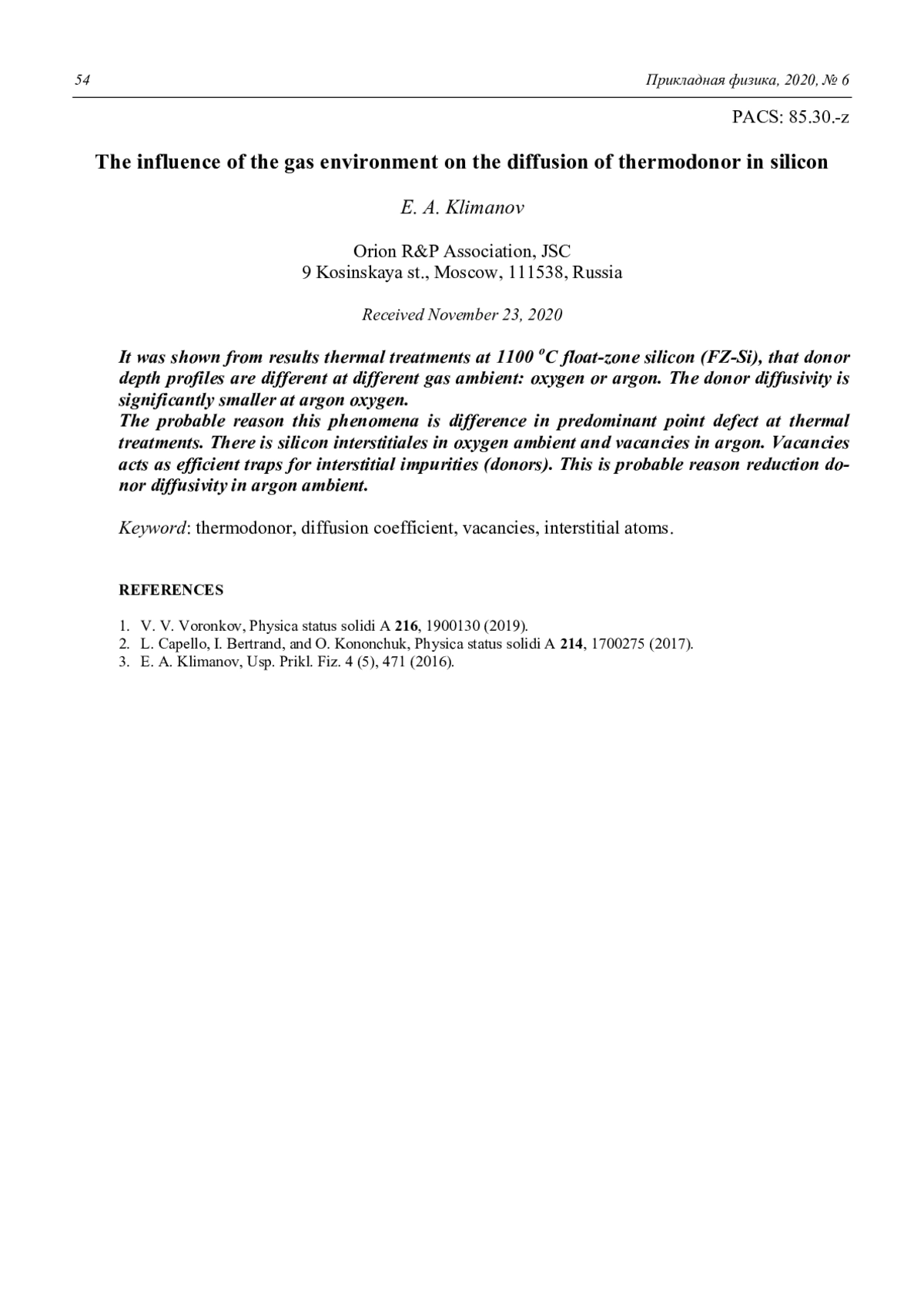 КЛИМАНОВ Е. А. ВЛИЯНИЕ ГАЗОВОЙ СРЕДЫ НА ДИФФУЗИЮ ТЕРМОДОНОРОВ В КРЕМНИИ // ПРИКЛАДНАЯ ФИЗИКА. 2020. №6