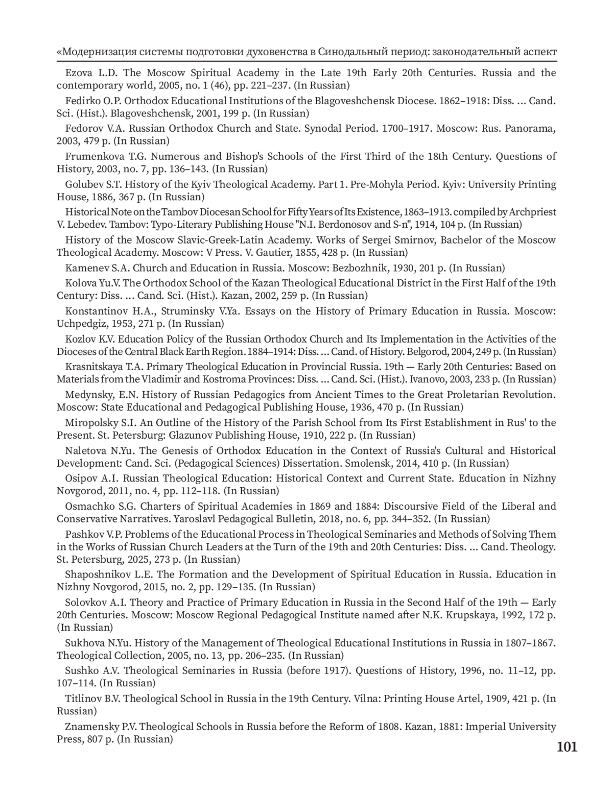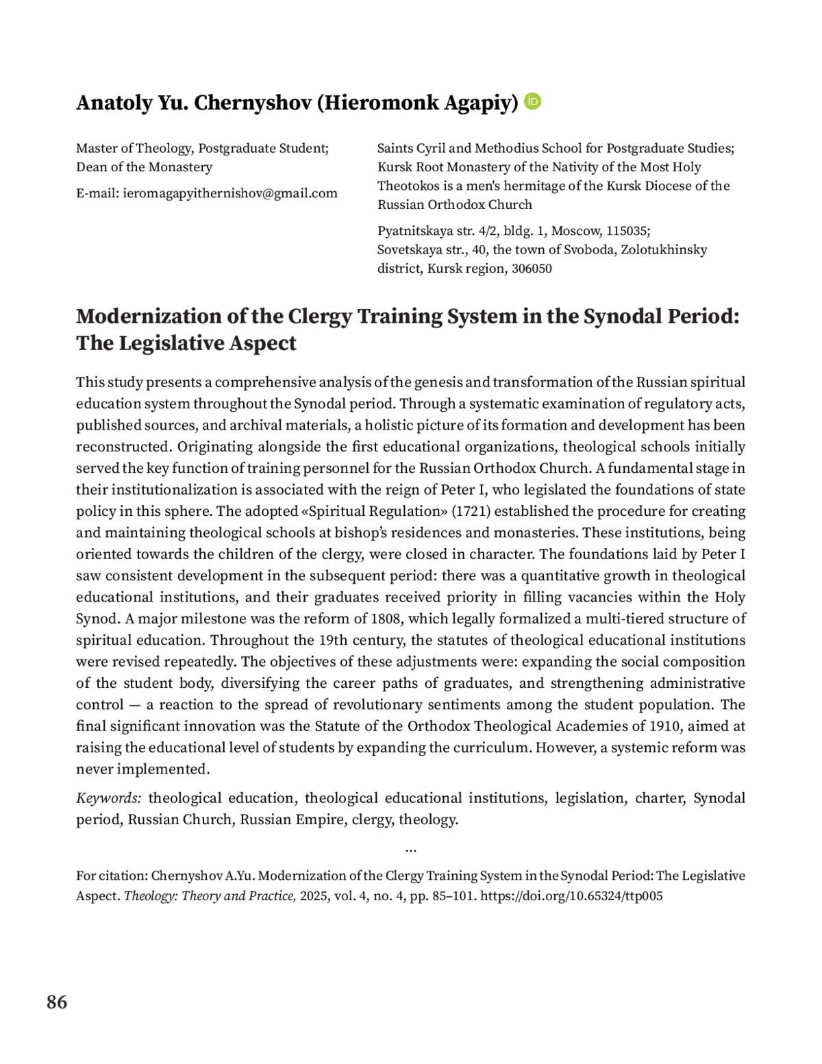 ЧЕРНЫШОВ А. Ю. МОДЕРНИЗАЦИЯ СИСТЕМЫ ПОДГОТОВКИ ДУХОВЕНСТВА В СИНОДАЛЬНЫЙ ПЕРИОД: ЗАКОНОДАТЕЛЬНЫЙ АСПЕКТ // ТЕОЛОГИЯ: ТЕОРИЯ И ПРАКТИКА. 2025. № 3, ТОМ 4