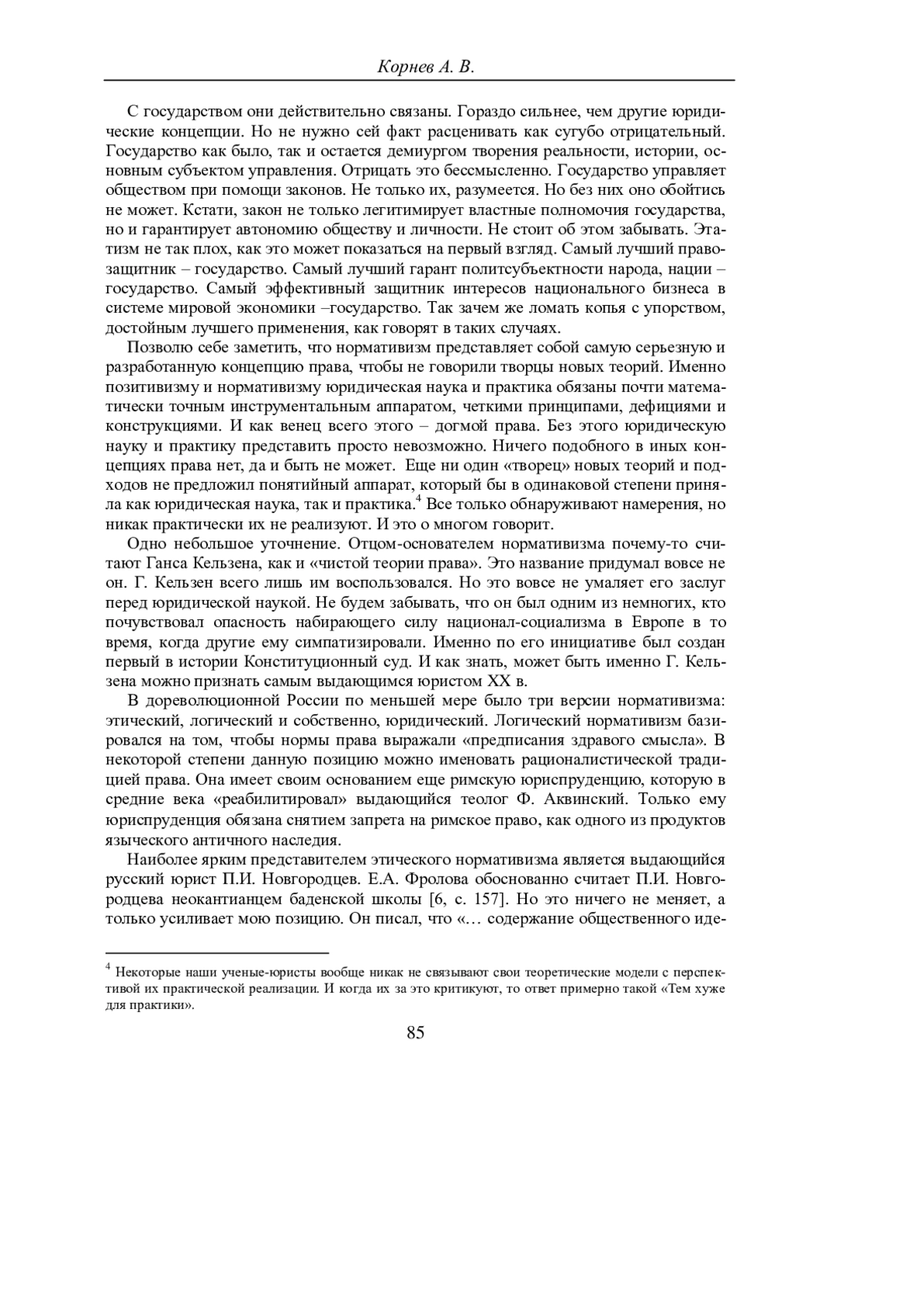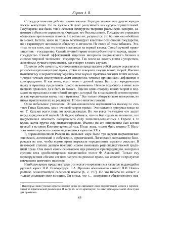 Кроме того, в статье фрагментарно рассматриваются основные правовые концепции, которые находятся в своеобразной конкуренции между собой и, тем не менее, консолидировано выступают против юридического позитивизма и нормативизма. Подчеркивается, что современная юридическая наука не столь хорошо знакома с различными вариантами нормативизма. И, прежде всего, этического. Между тем, у него есть хорошие перспективы, как научные, так и практические.