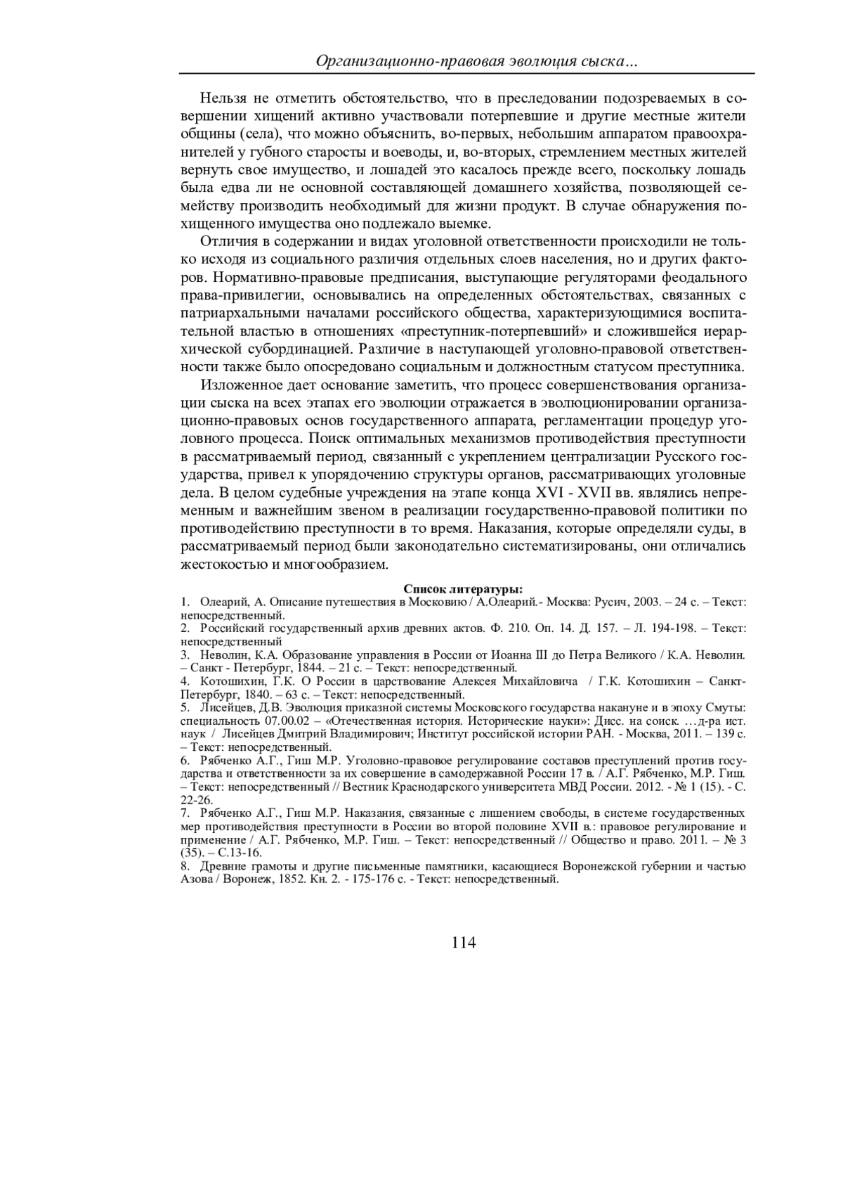 6. Рябченко А.Г., Гиш М.Р. Уголовно-правовое регулирование составов преступлений против государства и ответственности за их совершение в самодержавной России 17 в. / А.Г. Рябченко, М.Р. Гиш. - Текст: непосредственный // Вестник Краснодарского университета МВД России. 2012. - № 1 (15). - С. 22-26. EDN: PWZIKT