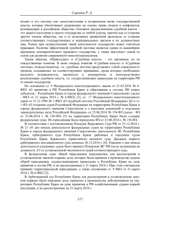 В статье исследованы порядок формирования федеральных судов соответствующей юрисдикции, их подведомственность и подсудность, особенности рассмотрения соответствующих дел, в т. ч. в первой и апелляционной инстанциях, финансовое и организационное обеспечение их деятельности в рассматриваемый исторический период и т. д. Работа содержит анализ определенных проблем осуществления деятельности судебных органов в Республике Крым, связанных с необходимостью взаимодействия норм российского и украинского законодательства в сфере осуществления правосудия именно в переходный период, и путей их преодоления. Рассмотрен вопрос применения общих правил преюдициальности в отношении судебных актов, принятых в Республике Крым в переходный период. Отдельно исследован порядок создания и деятельности мировых судов в Республике Крым в переходный период, их юрисдикция, требования к мировым судьям и т. д. Кроме того, в данной научной работе рассмотрено соотношение понятий «Правосудие», «Судебная власть» и «Судебная система».