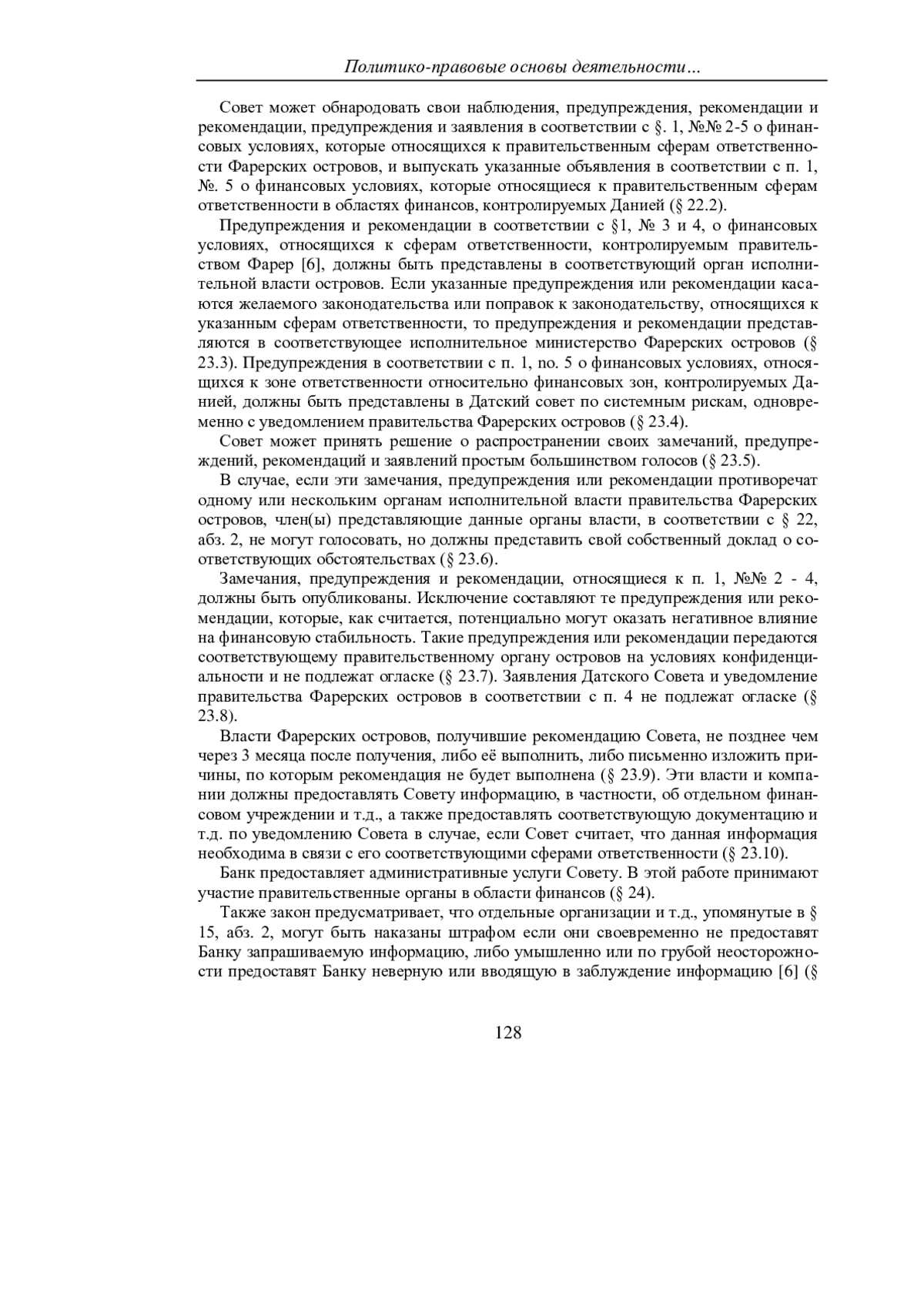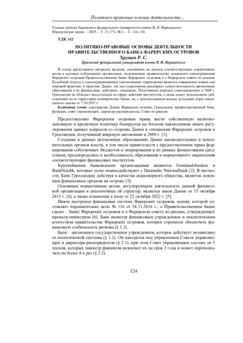 В статье представлено авторское видение, основанное на анализе соответствующих нормативных актов и научных публикациях организации, подчиненных правительству домашнего самоуправления Фарерских островов Правительственном банке Фарерских островов и о Фарерском совете по рискам. Подобный подход к самоуправляющимся (автономным) территориям является совершенно новым как мировой практике, и практике Дании, так как существенно расширяет самостоятельность автономных образований в их финансовых действиях, операциях. Получившая широкое самоуправление в 2009 г. Гренландия не обладает аналогичным по сфере действия институтом, а лишь может использовать действующие на ее территории коммерческие банки, но, с использованием весьма детальных норм специального закона от 7.10.2015 г.