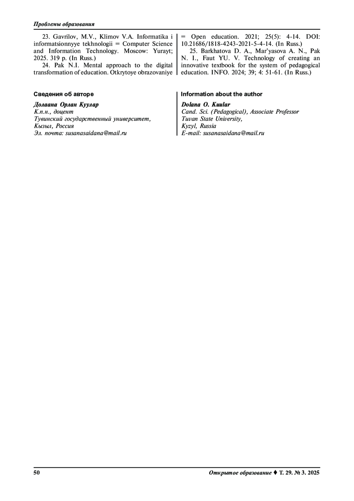 Заключение. Статистические данные анкетного опроса позволили представить билингвальный портрет жителей республики Тыва в целом, и студенческого контингента Тувинского государственного университета в частности. Следует отметить, что для значительного большинства обучаемых тувинский язык является родным, а русский язык – языком обучения. Анализ анкетных данных показывает актуальность и необходимость билингвального обучения предметам в школе и вузе. Эту позицию выразила значительная часть респондентов, включающих преподавателей, родителей и студентов. Результаты исследования позволили определить наиболее предпочтительный формат представления содержания учебных билингвальных ресурсов в синхронном и «перевернутом» виде. Безусловно следует развивать исследования механизмов билингвального мышления и на их основе создавать методические системы билингального обучения предметам в школах и вузах р. Тыва.