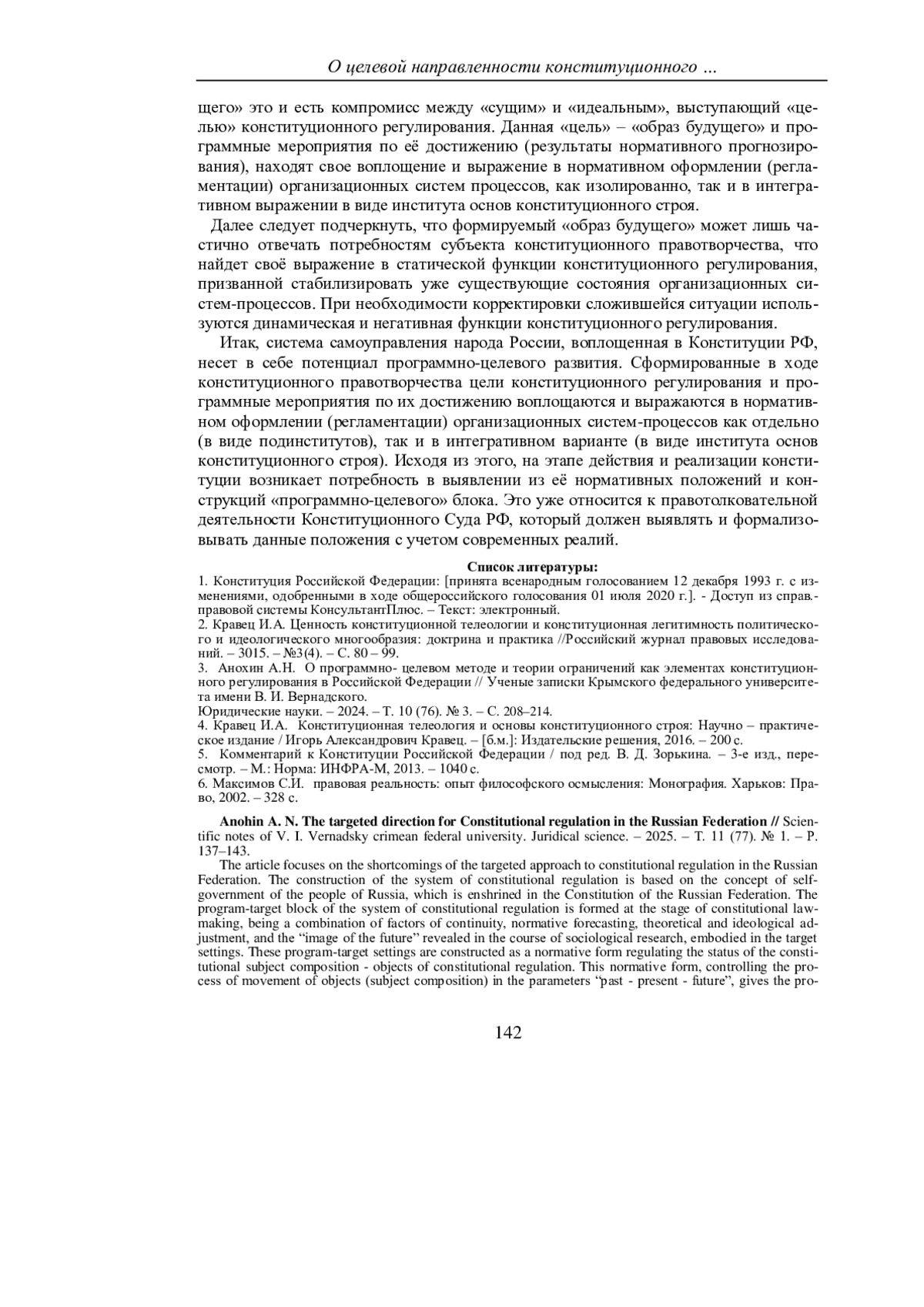 3. Анохин А.Н. О программно- целевом методе и теории ограничений как элементах конституционного регулирования в Российской Федерации // Ученые записки Крымского федерального университета имени В. И. Вернадского. Юридические науки. - 2024. - Т. 10 (76). № 3. - С. 208-214. EDN: TDPXYB