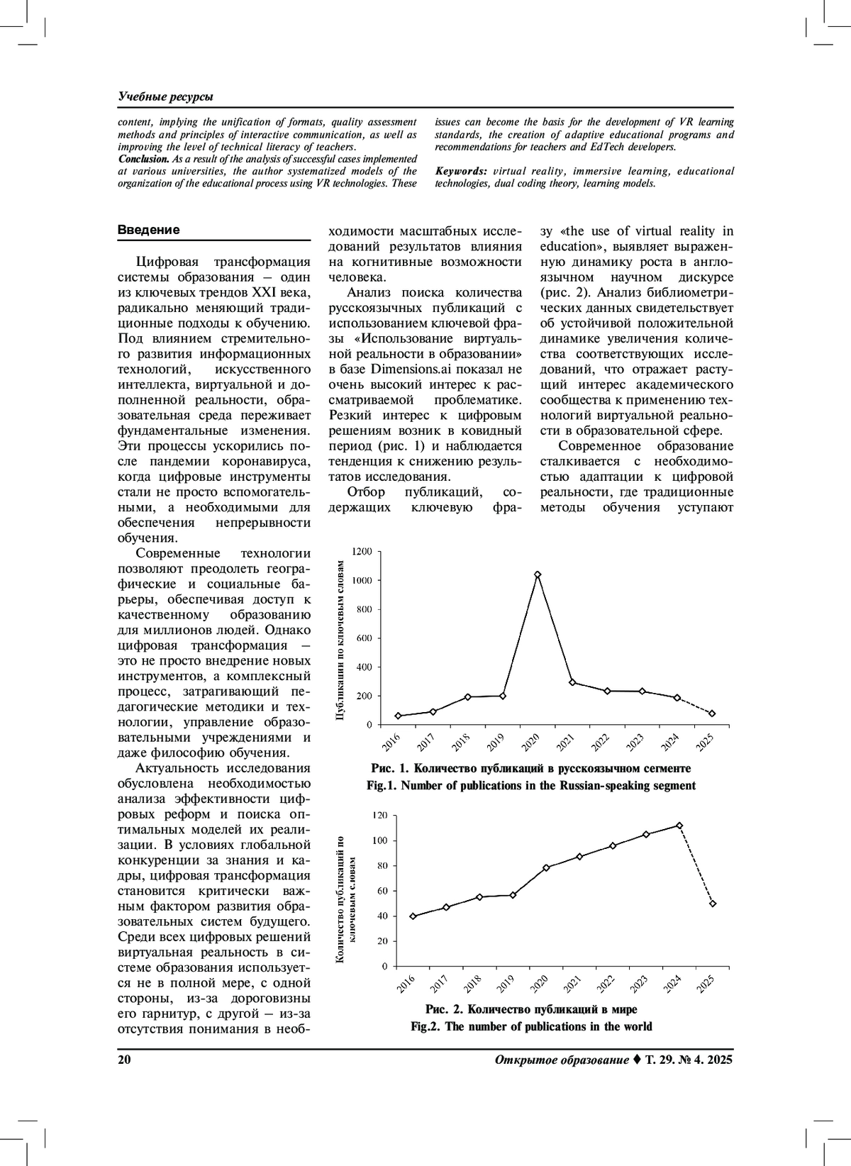 Материалы и методы. В работе использованы два основных метода: библиометрический и теоретический анализ. Была осуществлена выборка статей из базы Dimensions. ai для анализа публикационной активности по ключевым словам. При исследовании эффективности VR-обучения был проведен анализ существующих педагогических методик, применяемых в высшей школе, с выделением ключевых факторов, влияющих на усвоение материала. На основе синтеза исследований в области когнитивной психологии и цифровой дидактики разработана модель адаптивного VR-обучения, учитывающая индивидуальные когнитивные возможности студентов.