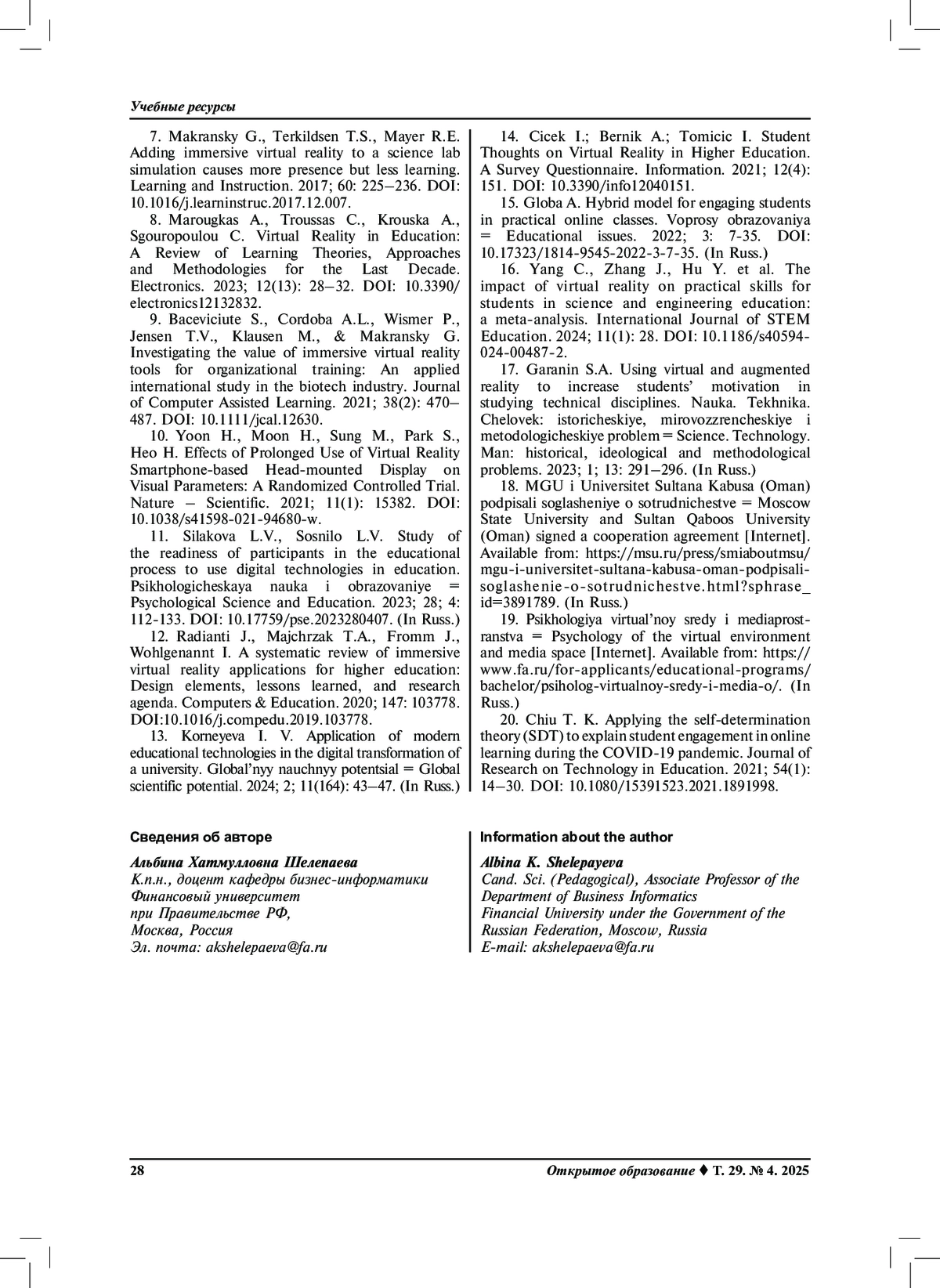Заключение. В результате анализа успешных кейсов, реализованных в различных университетах, автором систематизированы модели организации учебного процесса с использованием VR-технологий. Рассмотренные вопросы могут стать основой для разработки стандартов VR-обучения, создания адаптивных образовательных программ и рекомендаций для педагогов и разработчиков EdTech.