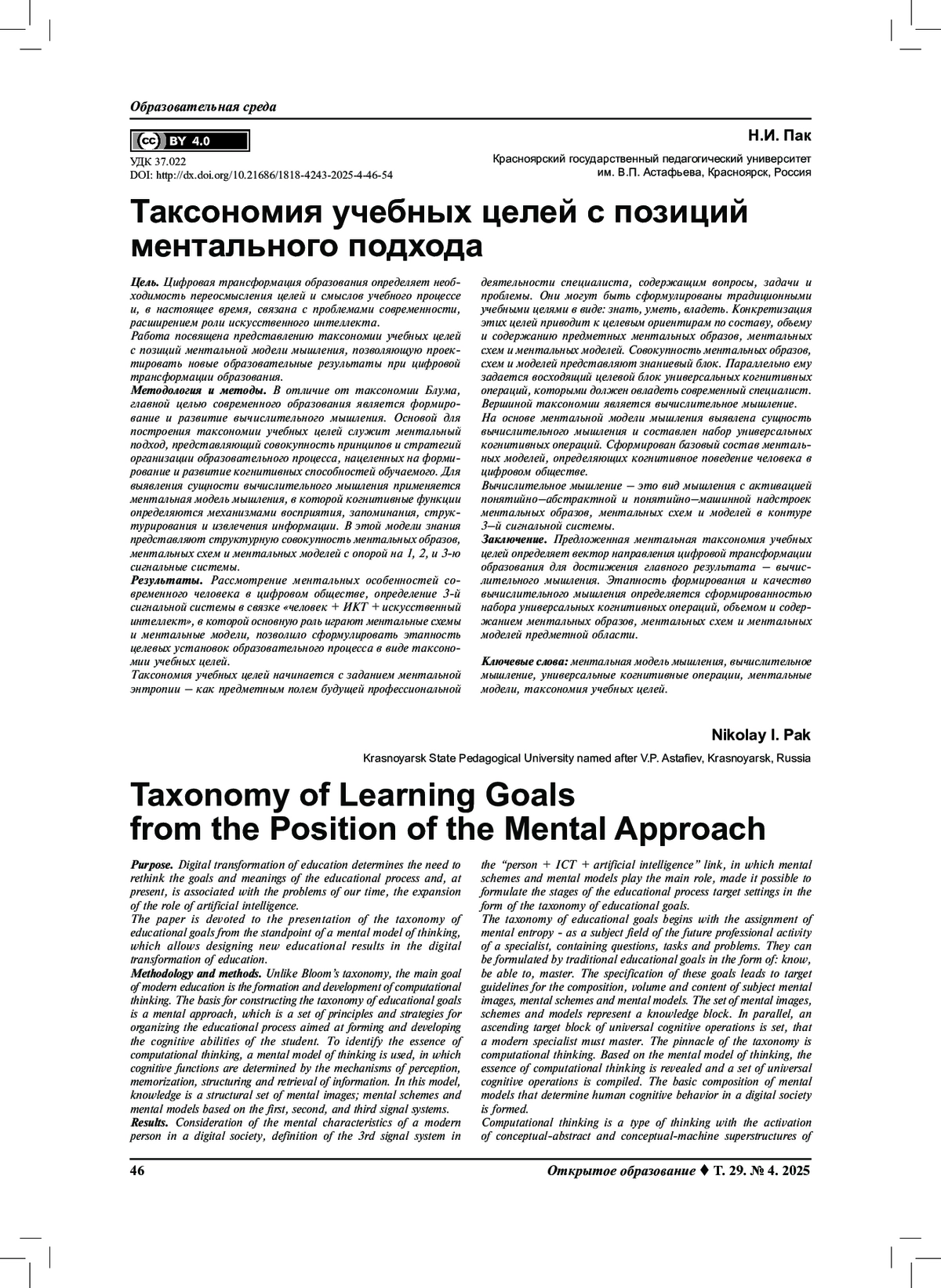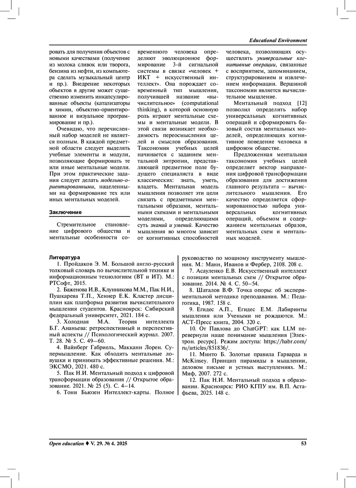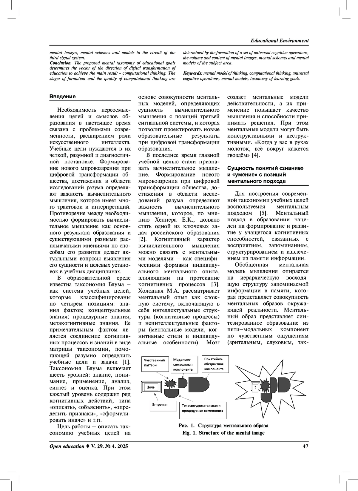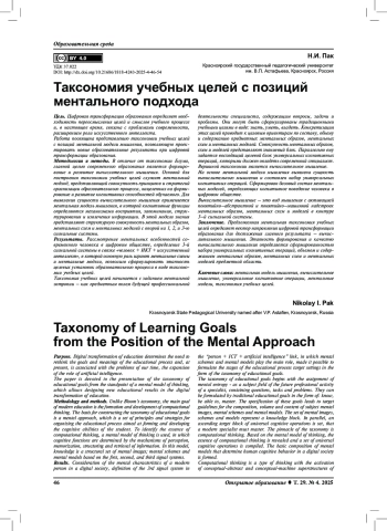 Результаты. Рассмотрение ментальных особенностей современного человека в цифровом обществе, определение 3-й сигнальной системы в связке «человек + ИКТ + искусственный интеллект», в которой основную роль играют ментальные схемы и ментальные модели, позволило сформулировать этапность целевых установок образовательного процесса в виде таксономии учебных целей. Таксономия учебных целей начинается с заданием ментальной энтропии – как предметным полем будущей профессиональной деятельности специалиста, содержащим вопросы, задачи и проблемы. Они могут быть сформулированы традиционными учебными целями в виде: знать, уметь, владеть. Конкретизация этих целей приводит к целевым ориентирам по составу, объему и содержанию предметных ментальных образов, ментальных схем и ментальных моделей. Совокупность ментальных образов, схем и моделей представляют знаниевый блок. Параллельно ему задается восходящий целевой блок универсальных когнитивных операций, которыми должен овладеть современный специалист. Вершиной таксономии является вычислительное мышление. На основе ментальной модели мышления выявлена сущность вычислительного мышления и составлен набор универсальных когнитивных операций. Сформирован базовый состав ментальных моделей, определяющих когнитивное поведение человека в цифровом обществе.