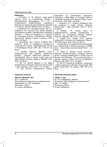 Заключение. Предложенная ментальная таксономия учебных целей определяет вектор направления цифровой трансформации образования для достижения главного результата – вычислительного мышления. Этапность формирования и качество вычислительного мышления определяется сформированностью набора универсальных когнитивных операций, объемом и содержанием ментальных образов, ментальных схем и ментальных моделей предметной области.