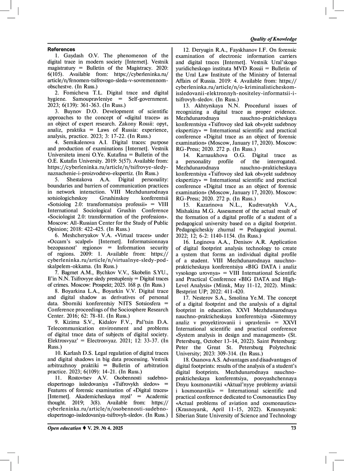 19. Черемисина Е.Н., Кирпичева Е.Ю., Токарева Н.А. и др. Цифровые следы: влияние на IT-образование и цифровую трансформацию // Физика элементарных частиц и атомного ядра. 2024. Т. 55. № 3. С. 519.