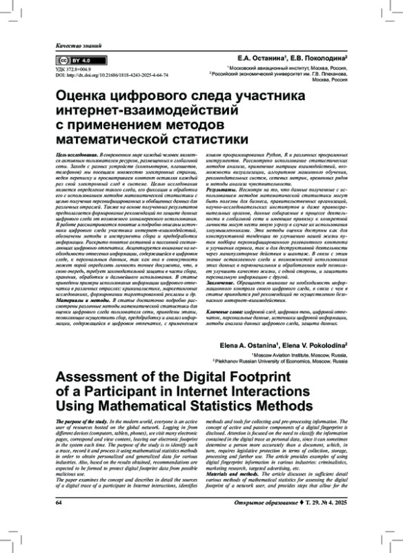 Материалы и методы. В статье достаточно подробно рассмотрены различные методы математической статистики для оценки цифрового следа пользователя сети, приведены этапы, позволяющие осуществить сбор, предобработку и анализ информации, содержащейся в цифровом отпечатке, с применением языков программирования Python, R и различных программных инструментов. Рассмотрено использование статистических методов анализа, применение матрицы взаимодействий, возможности визуализации, алгоритмов машинного обучения, рекомендательных систем, сетевых метрик, временных рядов и методы анализа чувствительности.