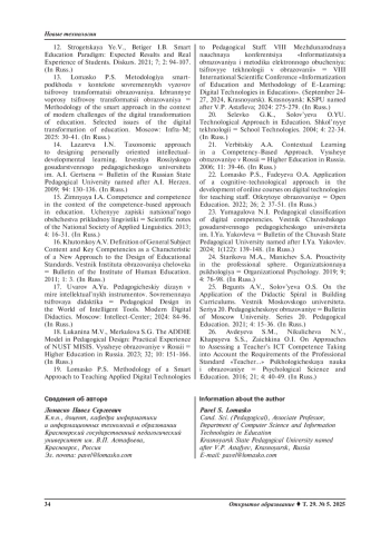 Заключение. Созданная модель обеспечивает научно-методологическую базу для проектирования персонализированных образовательных траекторий в системе непрерывного профессионального развития педагогических кадров. Типологизация компетенций по принципу межуровневого распределения создает условия для гибкого формирования индивидуальных программ освоения цифровых технологий с учетом профессиональных потребностей и начального уровня подготовки. Операционализация компетенций через измеримые действия позволяет осуществлять объективную диагностику профессиональных дефицитов и планировать целенаправленную коррекционную работу в условиях использования отечественного программного обеспечения и цифровых платформ.