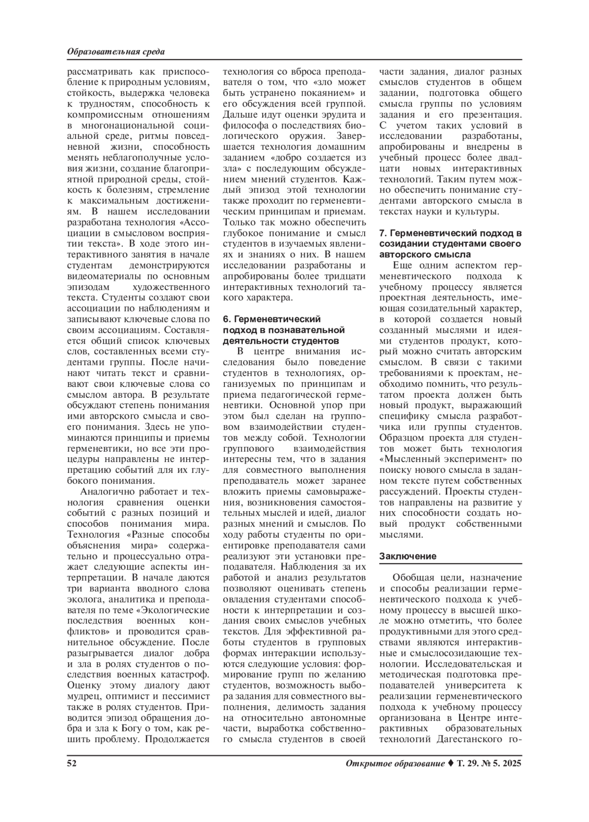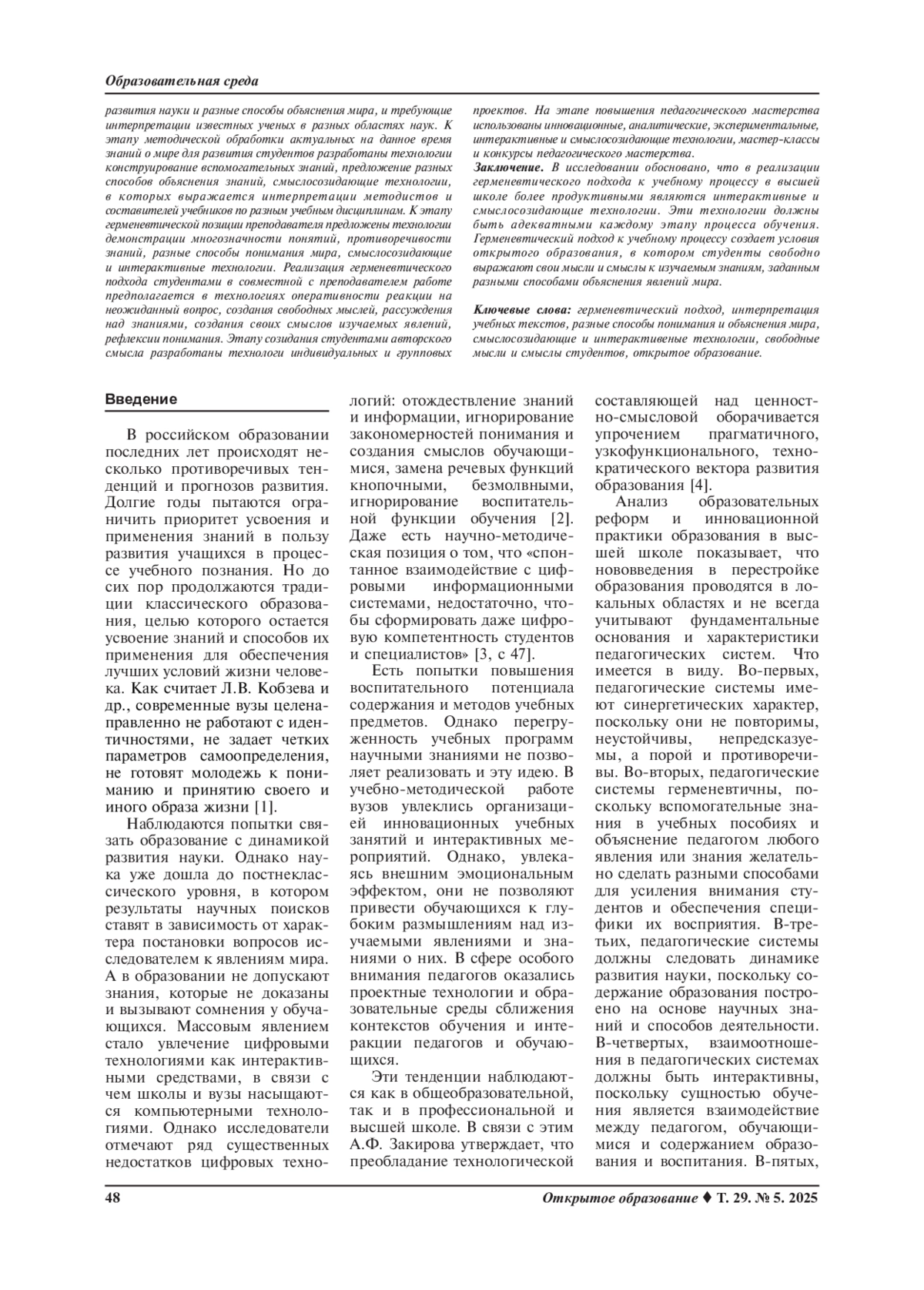 Статья: Технологии реализации герменевтического подхода к учебному процессу в вузе (2025)