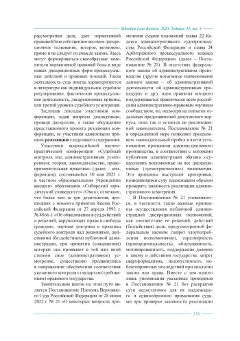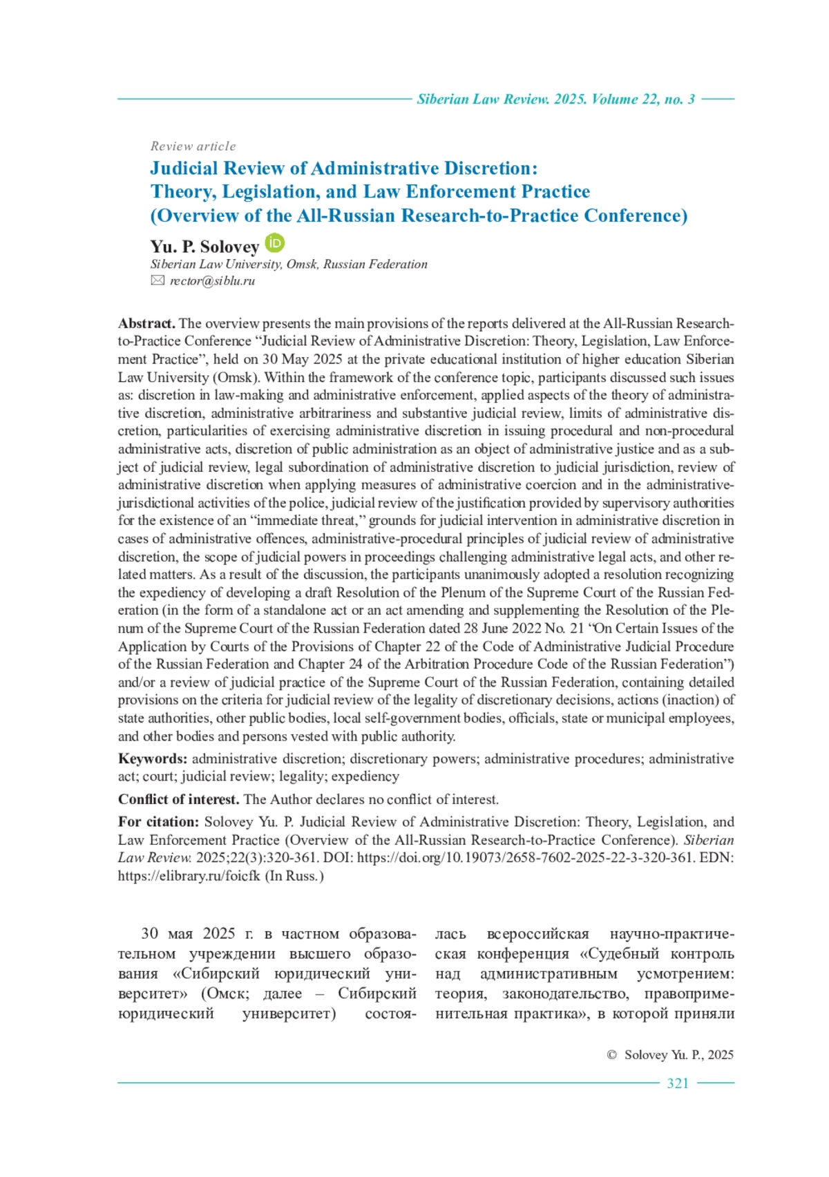 Обзор содержит основные положения докладов участников всероссийской научно-практической конференции «Судебный контроль над административным усмотрением: теория, законодательство, правоприменительная практика», состоявшейся 30 мая 2025 г. в частном образовательном учреждении высшего образования «Сибирский юридический университет» (Омск). В рамках темы конференции ее участники обсудили такие вопросы, как дискреционность в нормотворчестве и административном правоприменении, прикладные аспекты теории административного усмотрения, административный произвол и материальный судебный контроль, пределы административного усмотрения, особенности реализации административного усмотрения при издании процессуальных и внепроцессуальных административных актов, усмотрение публичной администрации как объект административного правосудия и как предмет судебного контроля, правовая подчиненность административного усмотрения судебной юрисдикции, контроль над административным усмотрением при применении мер административного принуждения, судебный контроль обоснования контрольными (надзорными) органами наличия «непосредственной угрозы», основания судебного вмешательства в административное усмотрение при рассмотрении дел об административных правонарушениях, административно-процессуальные принципы судебного контроля над административным усмотрением, пределы полномочий суда в рамках судопроизводства по делам об оспаривании административно-правовых актов и другие. По результатам состоявшейся дискуссии участники конференции единогласным голосованием приняли резолюцию, в которой признали целесообразной разработку проекта Постановления Пленума Верховного Суда Российской Федерации (в форме самостоятельного акта или акта, изменяющего и дополняющего Постановление Пленума Верховного Суда Российской Федерации от 28 июня 2022 г. № 21 «О некоторых вопросах применения судами положений главы 22 Кодекса административного судопроизводства Российской Федерации и главы 24 Арбитражного процессуального кодекса Российской Федерации») и (или) обзора судебной практики Верховного Суда Российской Федерации, содержащих развернутые положения о критериях судебной проверки законности дискреционных решений, действий (бездействия) органов государственной власти, иных государственных органов, органов местного самоуправления, должностных лиц, государственных или муниципальных служащих, иных органов и лиц, наделенных публичными полномочиями.