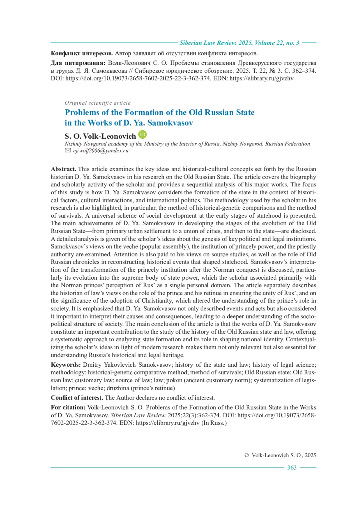 В данной статье рассматриваются ключевые идеи и историко-культурные концепции, изложенные российским историком Д. Я. Самоквасовым в его исследованиях Древнерусского государства. В статье освещается биография и научная деятельность ученого, последовательно анализируются его ключевые работы. В центре внимания настоящего исследования – то, как Д. Я. Самоквасов рассматривает формирование государства в контексте исторических факторов, культурных взаимодействий и международной политики. Также акцент делается и на методологии, использованной ученым в своих исследованиях, в частности, на методе историко-генетических сравнений и методе пережитков. Приводится универсальная схема развития общества на ранних этапах государственности. Раскрываются главные достижения Д. Я. Самоквасова в разработке основных стадий развития Древнерусского государства – от первичного городского поселения к союзу городов и далее к государству. Проводится детальный разбор представлений научного деятеля о генезисе ключевых политических и правовых институтов. Рассматриваются представления ученого о вечевой организации власти, институте княжеской власти и институте жреческой власти. Внимание уделяется и его взглядам на источниковедение, а также роль древнерусских летописей в реконструкции исторических событий и моментов, формировавших государственность. Рассматривается представление Д. Я. Самоквасова о трансформации института княжеской власти после норманнского завоевания, превращение данного института в высший орган государственной власти, связанное ученым, прежде всего, с представлением норманнских князей о Руси как едином собственном владении. Автором настоящей статьи отдельно описываются представления историка права о месте князя и дружины в обеспечении единства Руси, о значении принятия христианства, изменившего понимание роли князя в обществе. Подчеркивается, что Д. Я. Самоквасов не только описывал события и факты, но и считал важным осмысление их причин и последствий, что приводит к более глубокому пониманию социально-политического устройства общества. Основной вывод статьи заключается в том, что труды Д. Я. Самоквасова представляют собой важный вклад в изучение истории государства и права Древней Руси, предлагая системный подход к анализу становления государства и его роли в формировании национальной идентичности. Контекстуализация идей ученого в свете современных исследований делает их не только актуальными, но и необходимыми для понимания историко-правового наследия России.