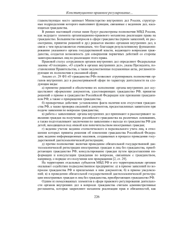 Актуальность статьи обусловлена современными геополитическими процессами, в которых особое значение отводится вопросам гражданства Российской Федерации. Гражданство представляет собой уникальный характер взаимоотношений между личностью и государством, который выражается в совокупности взаимных прав и обязанностей. Подчеркивая важность указанного положения, Конституция Российской Федерации содержит положение о том, что гражданство - это исключительная прерогатива органов государственной власти Российской Федерации. Ключевым звеном в механизме реализации конституционных положений о гражданстве являются органы внутренних дел, на которые законом возлагается большинство полномочий в указанной сфере. Автором рассмотрены основополагающие нормативно-правовые акты, регулирующие деятельность органов внутренних дел, как органов, ведающих в вопросах гражданства, выявлены некоторые проблемные аспекты в практике его применения, предложены пути совершенствования. В статье отмечается, что важной вехой в развитии конституционно-правового института «гражданства» стал 2023 г. Автором рассмотрены основные новеллы в законодательстве, а также механизм реализации новых институтов ОВД, таких как, например, «прекращение гражданства». Акцент также сделан на рассмотрении предоставления органами внутренних дел государственной услуги - регистрационный учет граждан по месту пребывания и жительства. Итогом стали сформулированные предложения по совершенствованию правового регулирования и практики его применения органами внутренних дел в сфере гражданства.
