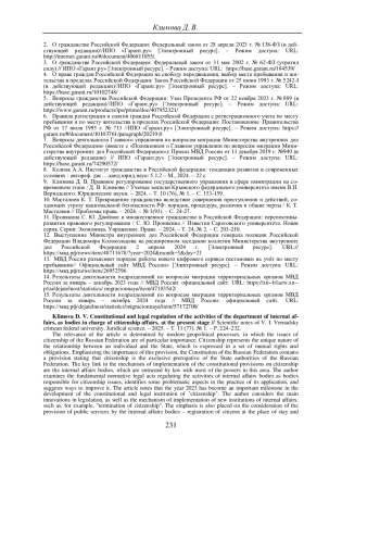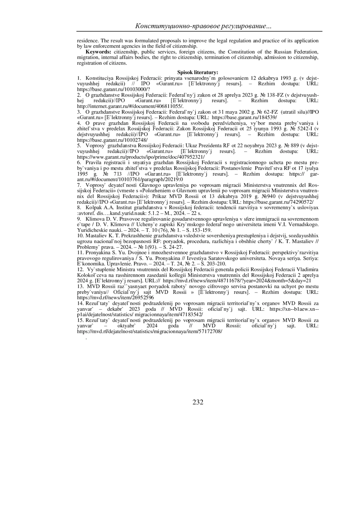 10. Масталиев К. Т. Прекращение гражданства вследствие совершения преступления и действий, создающих угрозу национальной безопасности РФ: порядок, процедура, различия и общие черты / К. Т. Масталиев // Проблемы права. - 2024. - № 1(93). - С. 24-27. EDN: UKLBEC 11. Пронякина С. Ю. Двойное и множественное гражданство в Российской Федерации: перспективы-развития правового регулирования / С. Ю. Пронякина // Известия Саратовского университета. Новая серия. Серия: Экономика. Управление. Право. - 2024. - Т. 24, № 2. - С. 203-210. EDN: FRWJXC