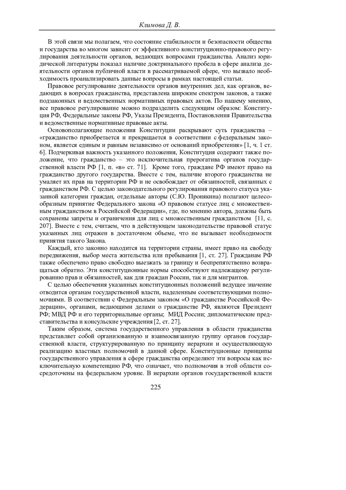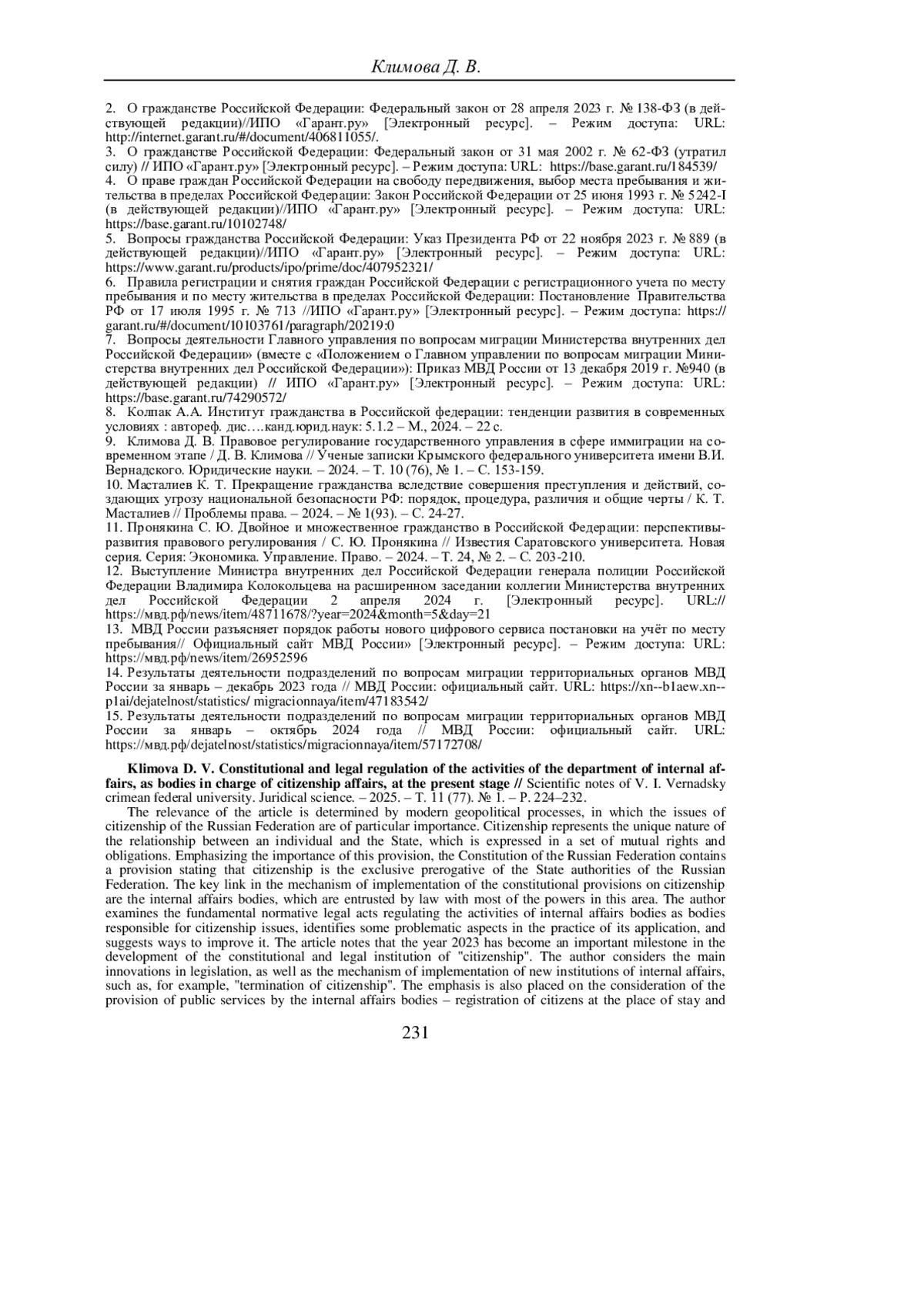 9. Климова Д. В. Правовое регулирование государственного управления в сфере иммиграции на современном этапе / Д. В. Климова // Ученые записки Крымского федерального университета имени В.И. Вернадского. Юридические науки. - 2024. - Т. 10 (76), № 1. - С. 153-159. EDN: BYWHSB