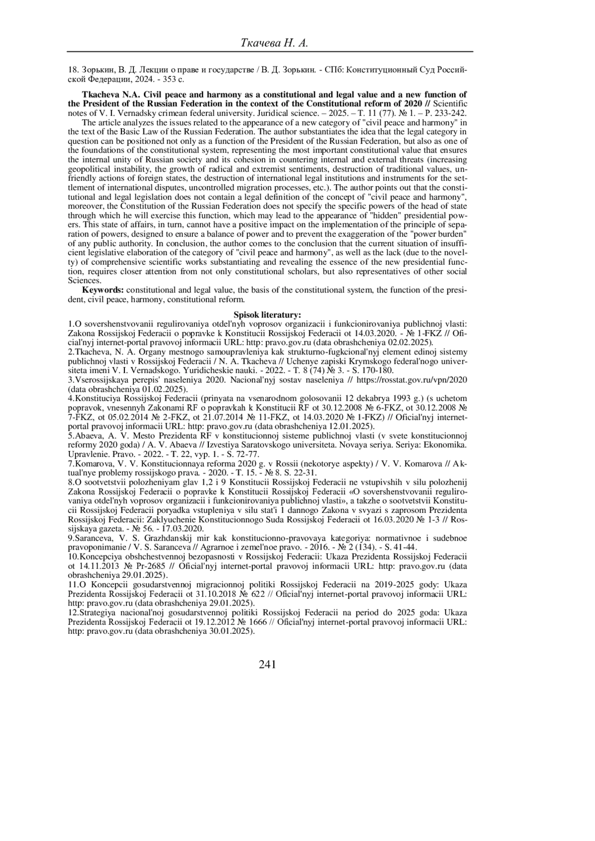 ТКАЧЕВА Н. А. ГРАЖДАНСКИЙ МИР И СОГЛАСИЕ КАК КОНСТИТУЦИОННО-ПРАВОВАЯ ЦЕННОСТЬ И НОВАЯ ФУНКЦИЯ ПРЕЗИДЕНТА РОССИЙСКОЙ ФЕДЕРАЦИИ В КОНТЕКСТЕ КОНСТИТУЦИОННОЙ РЕФОРМЫ 2020 ГОДА // УЧЕНЫЕ ЗАПИСКИ КРЫМСКОГО ФЕДЕРАЛЬНОГО УНИВЕРСИТЕТА ИМЕНИ В. И. ВЕРНАДСКОГО. ЮРИДИЧЕСКИЕ НАУКИ. 2025. ТОМ 11(77). №1