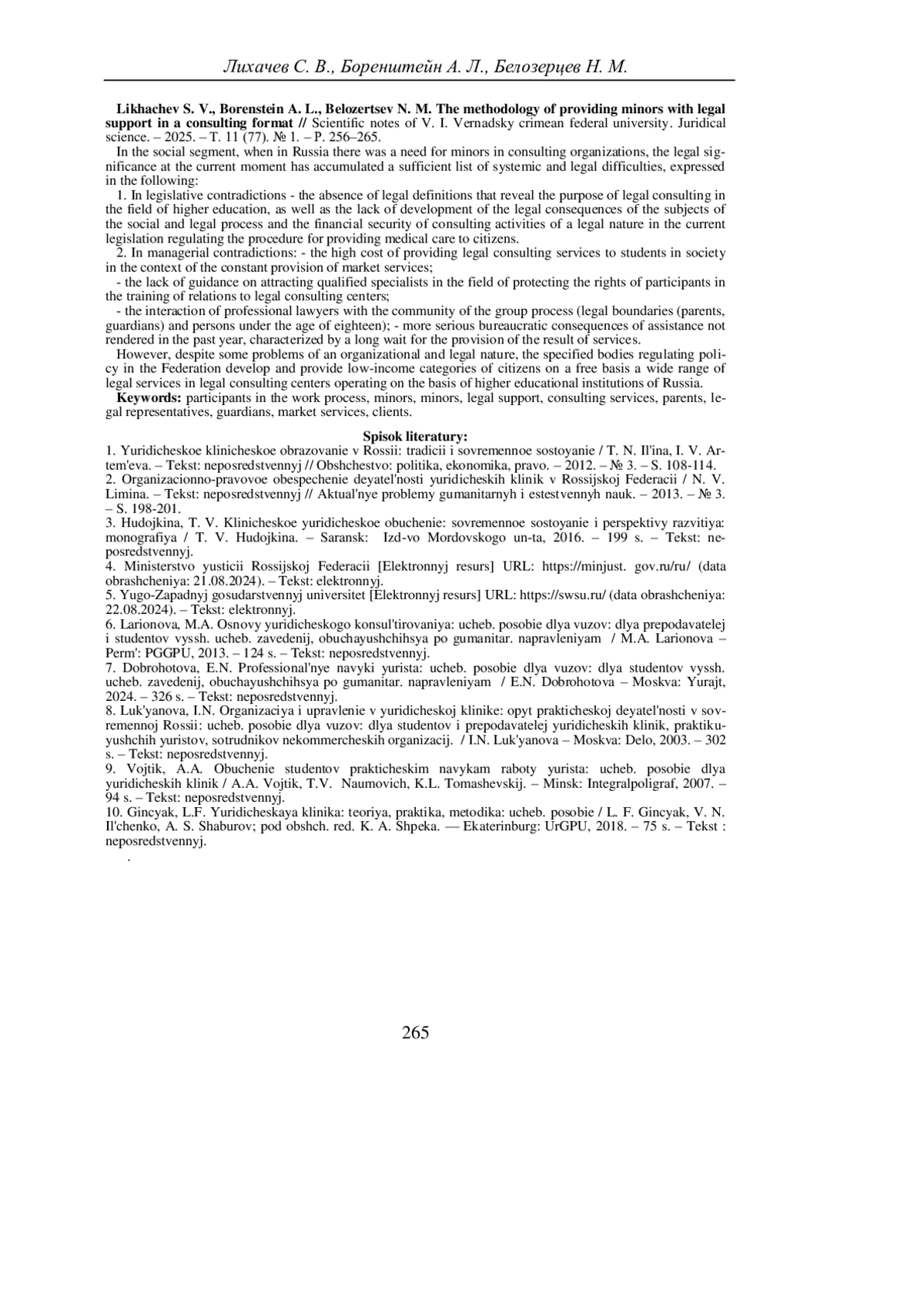 ЛИХАЧЕВ С. В., БОРЕНШТЕЙН А. Л., БЕЛОЗЕРЦЕВ Н. М. МЕТОДИКА ОБЕСПЕЧЕНИЯ НЕСОВЕРШЕННОЛЕТНИХ ГРАЖДАН ЮРИДИЧЕСКОЙ ПОДДЕРЖКОЙ В КОНСАЛТИНГОВОМ ФОРМАТЕ // УЧЕНЫЕ ЗАПИСКИ КРЫМСКОГО ФЕДЕРАЛЬНОГО УНИВЕРСИТЕТА ИМЕНИ В. И. ВЕРНАДСКОГО. ЮРИДИЧЕСКИЕ НАУКИ. 2025. ТОМ 11(77). №1