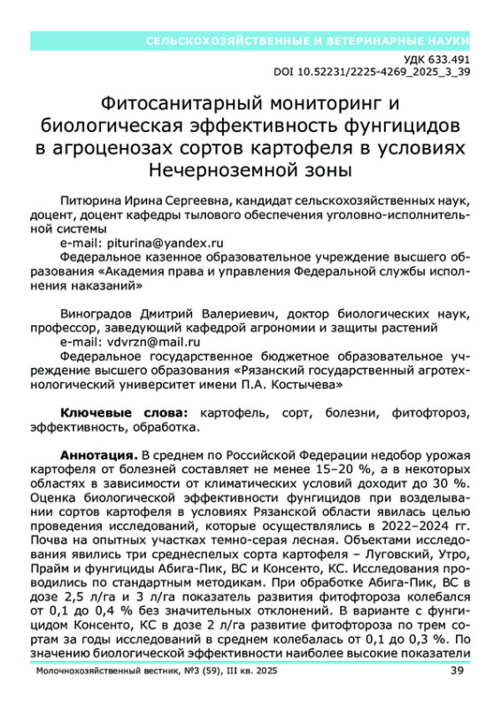 ПИТЮРИНА И. С., ВИНОГРАДОВ Д. В. ФИТОСАНИТАРНЫЙ МОНИТОРИНГ И БИОЛОГИЧЕСКАЯ ЭФФЕКТИВНОСТЬ ФУНГИЦИДОВ В АГРОЦЕНОЗАХ СОРТОВ КАРТОФЕЛЯ В УСЛОВИЯХ НЕЧЕРНОЗЕМНОЙ ЗОНЫ // МОЛОЧНОХОЗЯЙСТВЕННЫЙ ВЕСТНИК. 2025. № 3 (59)