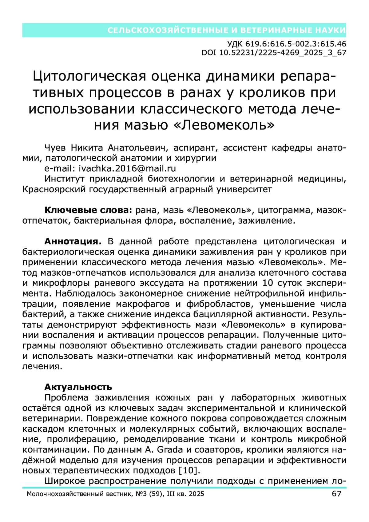 Статья: Цитологическая оценка динамики репаративных процессов в ранах у кроликов при использовании классического метода лечения мазью «Левомеколь» (2025)