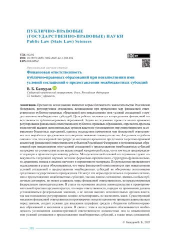Предметом исследования являются нормы бюджетного законодательства Российской Федерации, регулирующие отношения, возникающие при применении мер финансовой ответственности публично-правовых образований при невыполнении ими условий соглашений о предоставлении межбюджетных субсидий. Цель работы заключается в определении финансовой ответственности публично-правовых образований. Задачи исследования: провести анализ правового регулирования финансовой ответственности публично-правовых образований, определить пределы полномочий высших исполнительных органов власти по установлению мер ответственности за совершение бюджетных нарушений, оценить последствия применения мер финансовой ответственности и выработать предложения по совершенствованию законодательства. Актуальность работы связана с тем, что в научной литературе до настоящего времени не представлен теоретико-правовой анализ мер финансовой ответственности субъектов Российской Федерации и муниципальных образований при невыполнении ими условий соглашений о предоставлении межбюджетных субсидий на предмет их соответствия актам вышестоящей юридической силы, что в том числе предопределяет научную и практическую новизну работы. Методологической основой исследования служит совокупность следующих научных методов: формально-юридического, структурно-функционального, сравнения, поиска и анализа научного и нормативного материала. По результатам проведенного исследования в статье обосновывается, что меры финансовой ответственности при невыполнении условий соглашений о предоставлении межбюджетных субсидий не обеспечены легитимными средствами государственного принуждения. Не могут эти меры определяться и сторонами соглашения о предоставлении межбюджетных субсидий, так как данное соглашение, являясь особым публичным договором, не может содержать меры финансовой ответственности, не предусмотренные федеральным законодательством. В статье на основании анализа законодательства и правоприменительной практики аргументируется, что меры ответственности, порядок их применения должны устанавливаться федеральными законами, а не актами высших исполнительных органов власти, так как подзаконное регулирование должно детализировать, не восполнять закон. Существующий механизм финансовой ответственности противоречит конституционному принципу равенства всех перед законом, создает условия для взыскания штрафных средств с бюджетов публично-правовых образований и населения в целом. В связи с этим в исследовании обосновывается необходимость установления административной ответственности должностных лиц за невыполнение ими условий соглашения о предоставлении межбюджетных субсидий, а также иных соглашений.