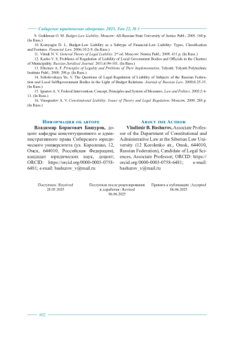 14. Соболевская Ю. В. Проблемы правового регулирования ответственности субъектов Российской Федерации и муниципальных образований в сфере бюджетных отношений // Журнал российского права. 2009.№ 8 (152). С. 25-35.