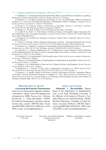 2. Гайдуков А. А. Административно-правовые меры пресечения правонарушений в семейно-бытовой сфере // Научный портал МВД России. 2024. № 1 (65). С. 45-52.