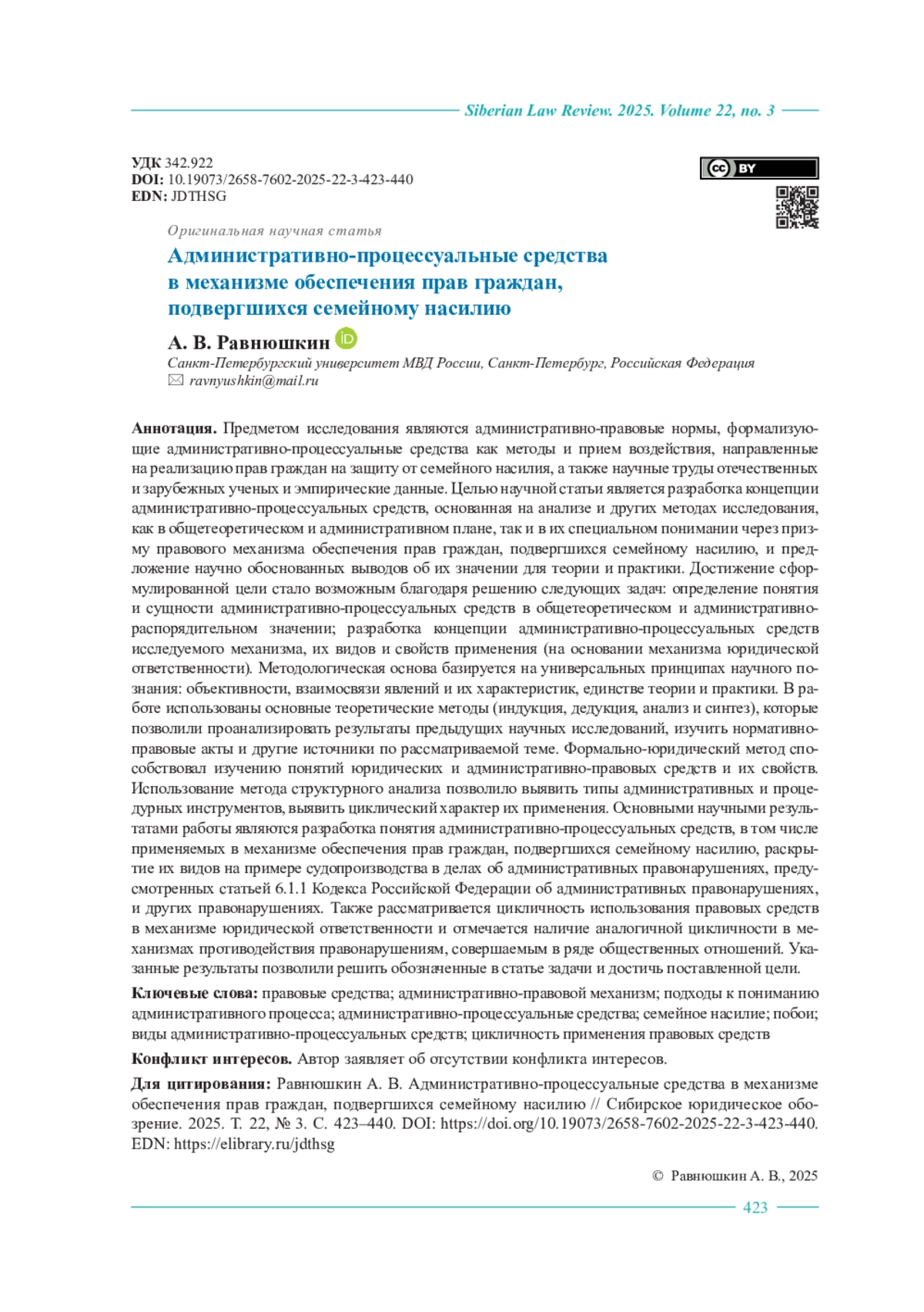 Предметом исследования являются административно-правовые нормы, формализующие административно-процессуальные средства как методы и прием воздействия, направленные на реализацию прав граждан на защиту от семейного насилия, а также научные труды отечественных и зарубежных ученых и эмпирические данные. Целью научной статьи является разработка концепции административно-процессуальных средств, основанная на анализе и других методах исследования, как в общетеоретическом и административном плане, так и в их специальном понимании через призму правового механизма обеспечения прав граждан, подвергшихся семейному насилию, и предложение научно обоснованных выводов об их значении для теории и практики. Достижение сформулированной цели стало возможным благодаря решению следующих задач: определение понятия и сущности административно-процессуальных средств в общетеоретическом и административно-распорядительном значении; разработка концепции административно-процессуальных средств исследуемого механизма, их видов и свойств применения (на основании механизма юридической ответственности). Методологическая основа базируется на универсальных принципах научного познания: объективности, взаимосвязи явлений и их характеристик, единстве теории и практики. В работе использованы основные теоретические методы (индукция, дедукция, анализ и синтез), которые позволили проанализировать результаты предыдущих научных исследований, изучить нормативно-правовые акты и другие источники по рассматриваемой теме. Формально-юридический метод способствовал изучению понятий юридических и административно-правовых средств и их свойств. Использование метода структурного анализа позволило выявить типы административных и процедурных инструментов, выявить циклический характер их применения. Основными научными результатами работы являются разработка понятия административно-процессуальных средств, в том числе применяемых в механизме обеспечения прав граждан, подвергшихся семейному насилию, раскрытие их видов на примере судопроизводства в делах об административных правонарушениях, предусмотренных статьей 6.1.1 Кодекса Российской Федерации об административных правонарушениях, и других правонарушениях. Также рассматривается цикличность использования правовых средств в механизме юридической ответственности и отмечается наличие аналогичной цикличности в механизмах противодействия правонарушениям, совершаемым в ряде общественных отношений. Указанные результаты позволили решить обозначенные в статье задачи и достичь поставленной цели.