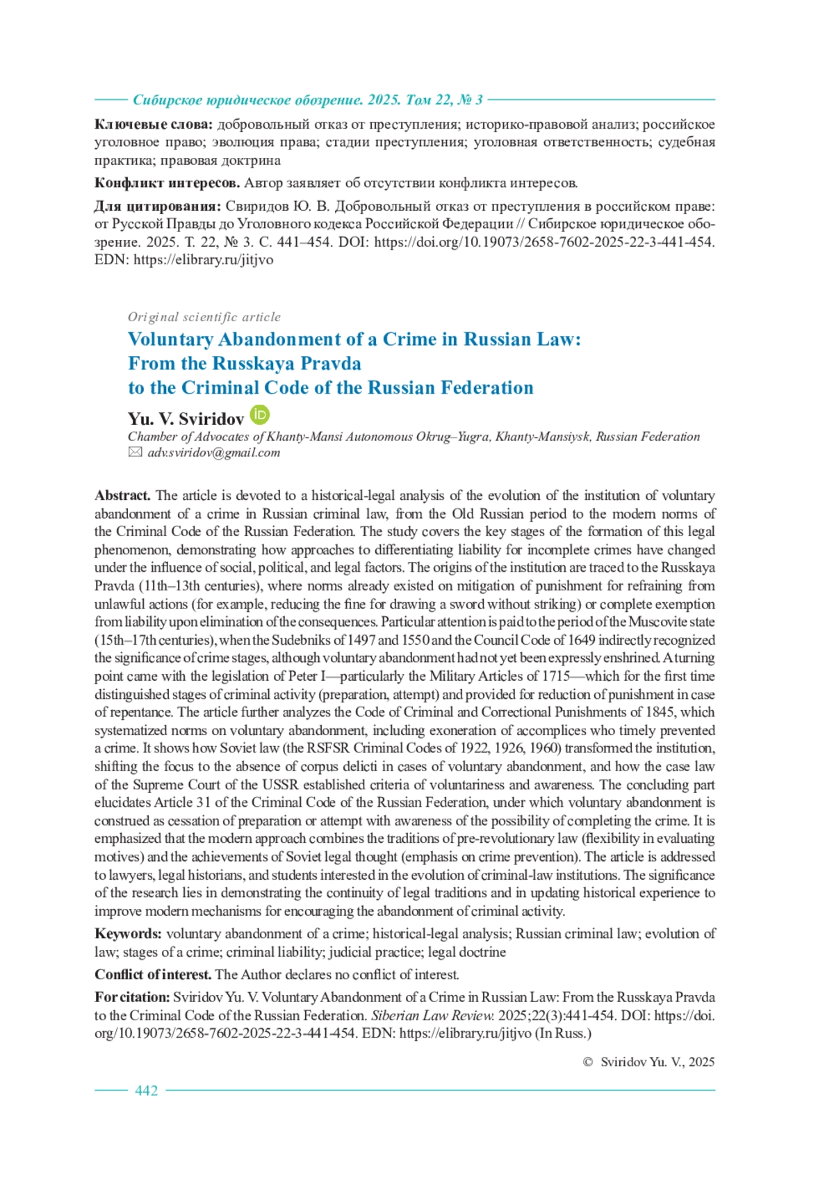 Статья посвящена историко-правовому анализу эволюции института добровольного отказа от преступления в российском уголовном праве, начиная с древнерусского периода и заканчивая современными нормами Уголовного кодекса Российской Федерации. Исследование охватывает ключевые этапы формирования данного правового явления, демонстрируя, как под влиянием социальных, политических и правовых факторов менялись подходы к дифференциации ответственности за незавершенные преступления. В работе прослеживаются истоки института в Русской Правде (XI–XIII вв.), где уже встречались нормы о смягчении наказания за отказ от противоправных действий (например, снижение штрафа за обнажение меча без нанесения удара) или полном освобождении от ответственности при устранении последствий деяния. Особое внимание уделено периоду Московского государства (XV–XVII вв.), когда в Судебниках 1497 и 1550 гг. и Соборном уложении 1649 г. косвенно признавалась значимость стадий преступления, хотя прямого закрепления добровольного отказа еще не существовало. Переломным моментом стало законодательство Петра I, в частности Артикул воинский 1715 г., впервые выделивший стадии преступной деятельности (приготовление, покушение) и предусмотревший снижение наказания за раскаяние. Далее в статье анализируется Уложение о наказаниях уголовных и исправительных 1845 г., систематизировавшее нормы о добровольном отказе, включая освобождение от ответственности соучастников при своевременном предотвращении преступления. Показано, как советское право (Уголовные кодексы РСФСР 1922, 1926, 1960 гг.) трансформировало институт, сместив акцент на отсутствие состава преступления при добровольном отказе, а также как судебная практика Верховного Суда СССР закрепила критерии добровольности и осознанности. В заключительной части раскрыты положения ст. 31 Уголовного кодекса Российской Федерации, где добровольный отказ трактуется как прекращение приготовления или покушения при осознании возможности завершить преступление. Подчеркивается, что современный подход сочетает традиции дореволюционного права (гибкость оценки мотивов) и достижения советской юридической мысли (акцент на предупреждение преступлений). Статья адресована юристам, историкам права и обучающимся, интересующимся эволюцией уголовно-правовых институтов. Значение исследования заключается в демонстрации преемственности правовых традиций, а также в актуализации исторического опыта для совершенствования современных механизмов стимулирования отказа от преступной деятельности.