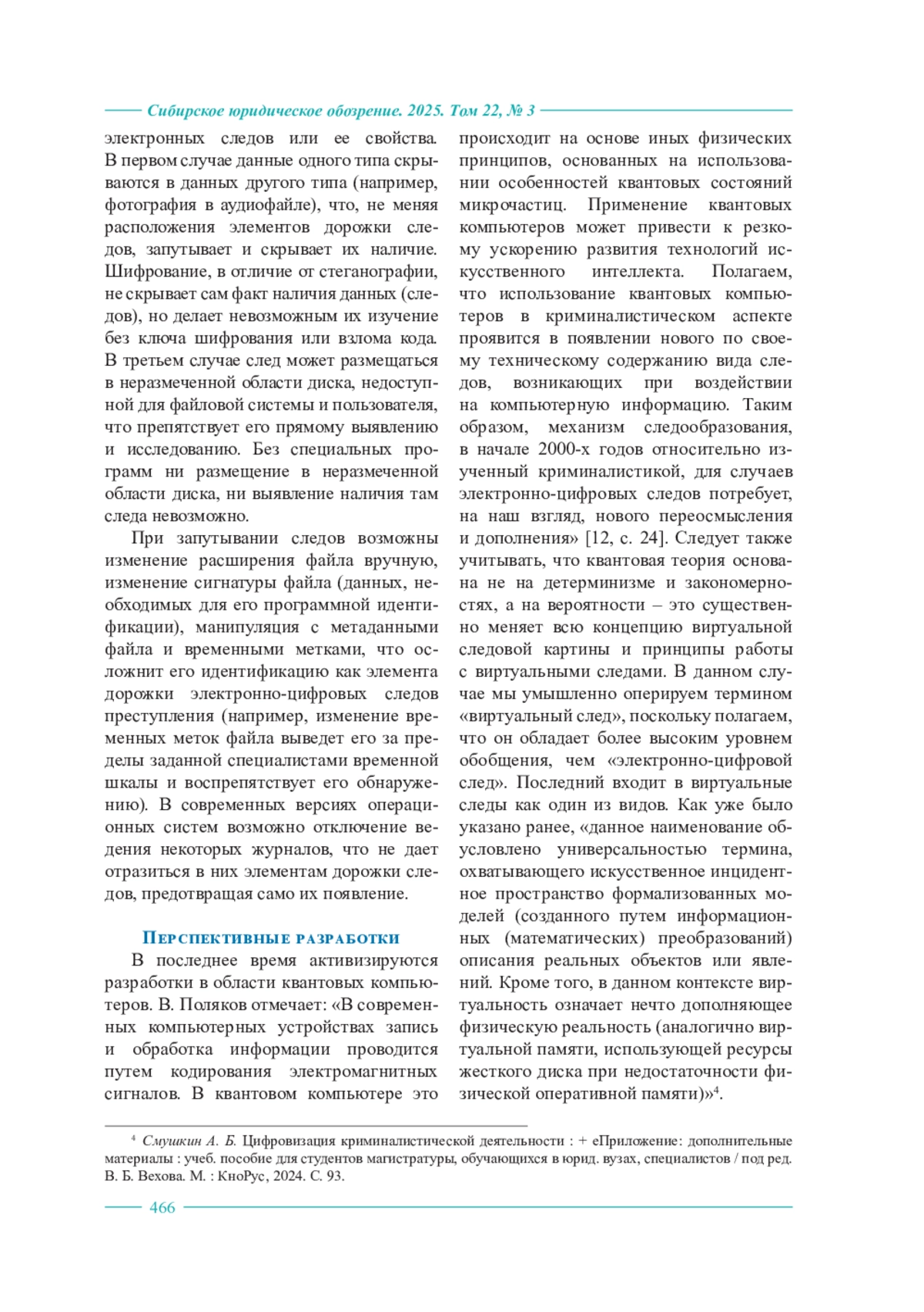 Данная работа нацелена на рассмотрение следовой картины в киберпространстве в современных условиях. Концепцию дорожки цифровых следов (в нашей трактовке – электронно-цифровых) предложил В. Б. Вехов еще в 2008 г., доработав в более поздних публикациях. Отслеживание дорожки электронно-цифровых следов имеет ключевое значение при расследовании преступлений, связанных с использованием информационно-технологических устройств. Однако в настоящее время появилось множество новых форм информации, средств сокрытия следов в киберпространстве. Некоторые современные концепты в области электронной техники оказывают существенное влияние на трансформацию дорожки электронно-цифровых следов, внося существенные изменения в ее цепочку, образуя разрывы, уводя в сторону, анонимизируя точку старта и/или финиша запроса, дробя и пряча следы. В этой связи целью работы является раскрытие специфики следовой дорожки в контексте неклассических форм размещения и использования электронной информации. Анализируется изменение дорожки электронно-цифровых следов при использовании виртуальных машин с многоуровневой вложенностью и средств виртуализации (например, VPN-сервисов), полиморфных программ, распределенной и облачной информации, блокчейна, RAID-массивов, средств сокрытия дорожки электронно-цифровых следов, отдельных перспективных разработок в области компьютерной техники. Статья основана на использовании материалистической диалектики как всеобщего метода, так и общенаучных методов (анализа, синтеза, моделирования, экстраполяции и др.). В результате исследования определены специфические свойства и характеристики дорожки электронно-цифровых следов при использовании рассмотренных концептов в области электронной информации. Констатируется, что новые концепты в области электронной информации существенно меняют следовую картину в киберпространстве и требуют специфических подходов, поэтому особое значение приобретают исследования на стыке технических наук, программирования и криминалистики, раскрывающие особые характеристики новых технологий и форм информации, требующих разработки специфических криминалистических рекомендаций. При этом, в связи с непрерывным научно-техническим прогрессом, эти исследования должны перманентно сопровождать новинки технологий, а в некоторых случаях (например, квантовых технологий) носить перспективный характер, дающий в руки правоохранительных органов действенные инструменты еще до широкого распространения самих технологий и использования их в преступных целях.